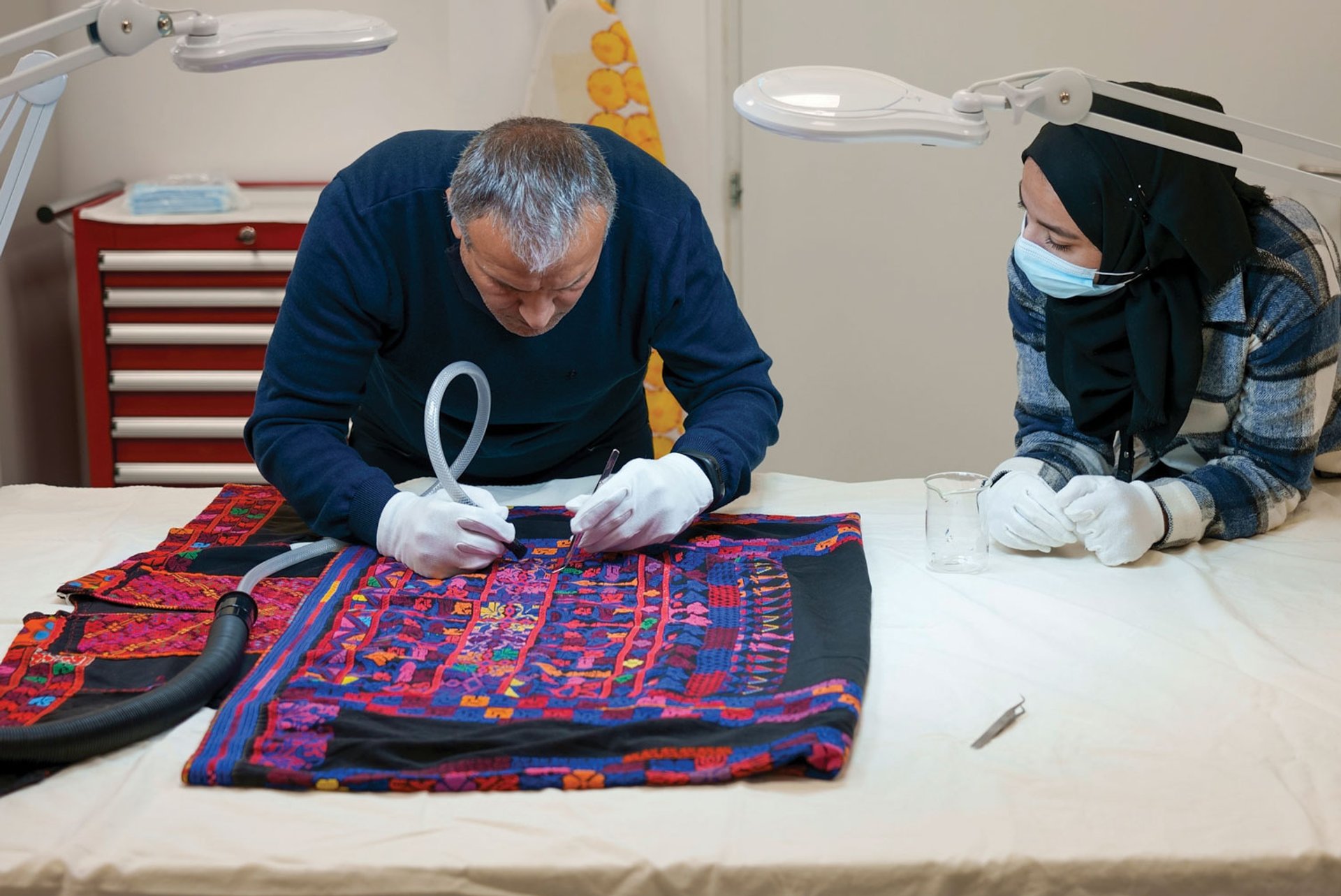 Conservation of a Palestinian embroidered thobe from Bir al-Sabi’ (1940s) at the Palestinian Museum in 2021 Photo: Hareth Yousef; © the Palestinian Museum