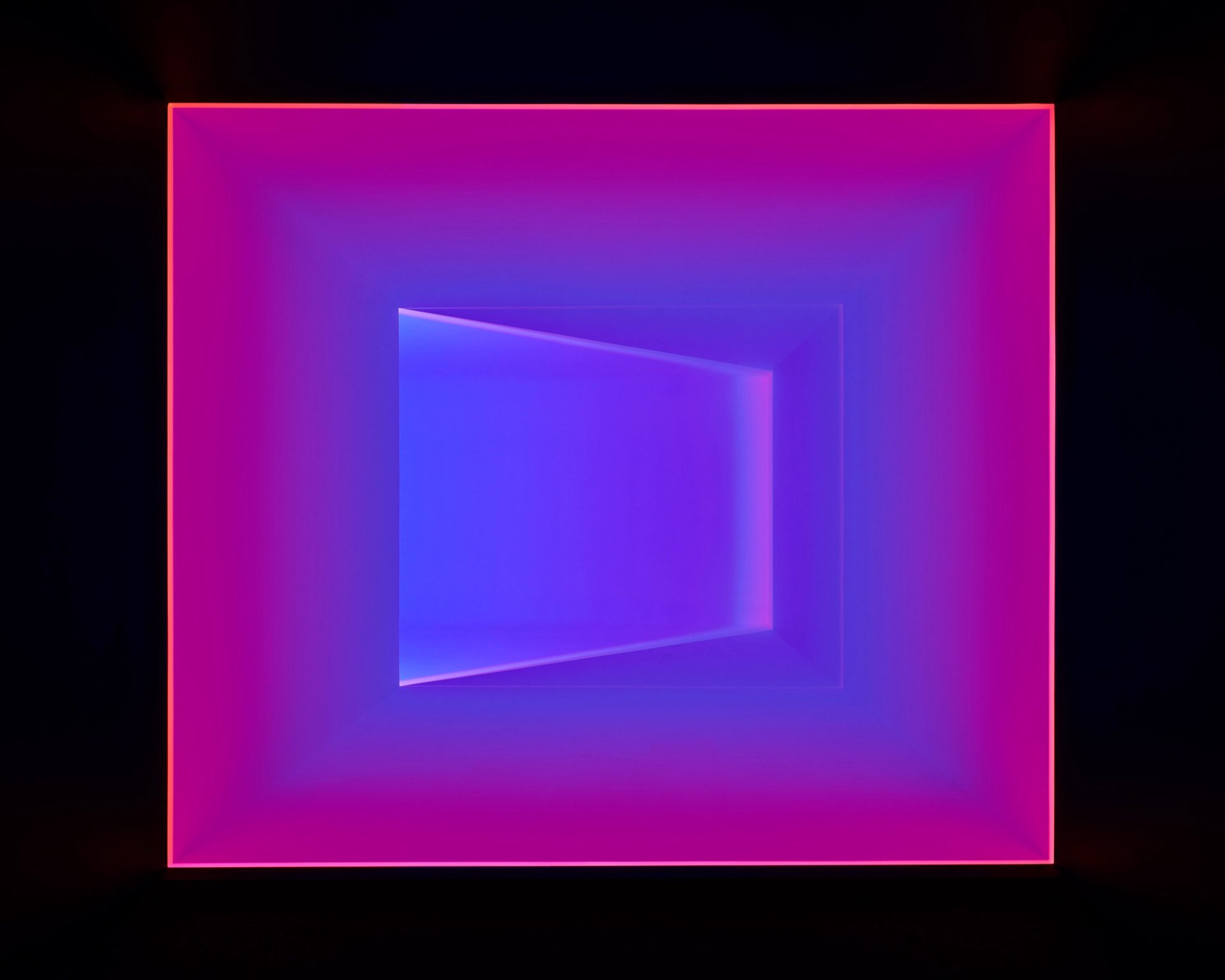 It’s the last week to see James Turrell’s rapturous ode to the monochromatic colour studies of the painter Ad Reinhardt. The exhibition begins with the new installation After Effect (2021) by Turrell, an iridescent light sculpture made up of luminous rectangular planes, appearing three-dimensional, and leads to a presentation of seven red, black and blue paintings by Reinhardt from the 1950s and 1960s. Turrell designed the lighting and display of the exhibition, which gives each painting its own designated viewing space and aims to maximise the perceptual subtleties in Reinhardt’s work, which at first appear starkly minimal but contain a profusion of colour and depth. The show aims to draw connections between the artists’ seemingly antithetical practices. Turrell cites Reinhardt’s approach to colour as a lifelong influence, having first encountered the artist’s work while a student in the 1960s, when he attended a lecture by the artist at the Pasadena Museum.