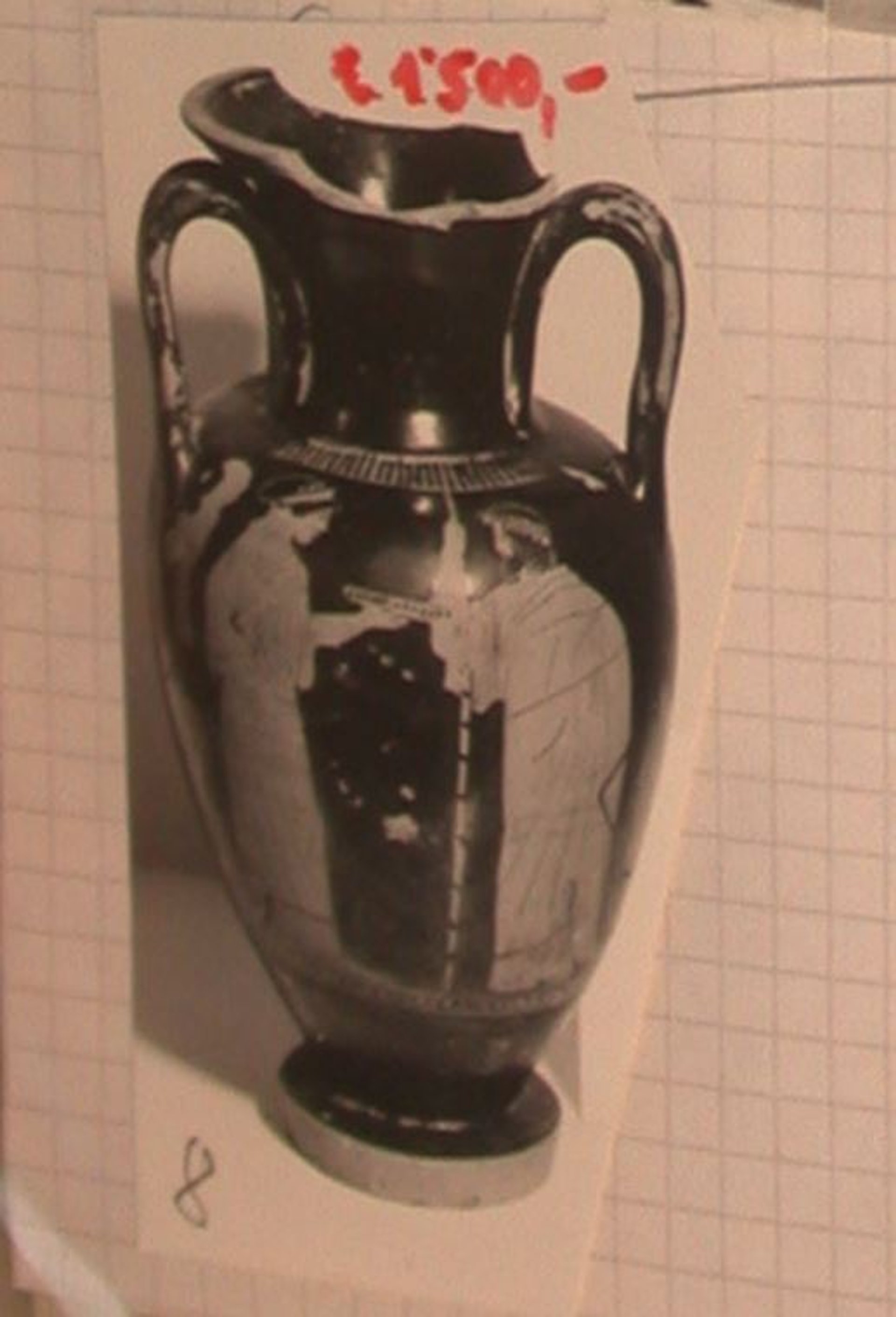 Tsirogiannis says the vase, a Nolan amphora that dates to around 450BC, can be traced to convicted antiquities dealer Gianfranco Becchina through his photographic archives, which were seized by Swiss authorities in 2001 and turned over to one of Italy’s main law enforcement agencies, the Carabinieri. The helmet, he says, can be traced also through photographic archives to Robert Hecht, who in 1972 sold the Euphronios krater to New York’s Metropolitan Museum of Art, an artefact which was later found to have been looted from Italy and that was repatriated to the country in 2008. Hecht stood trial in 2005 for allegedly dealing in looted artefacts, but was never convicted. Despite that he was for years under suspicion of channeling looted artefacts to museums with a cadre of coconspirators, including the convicted Italian antiquities dealer Giacomo Medici.