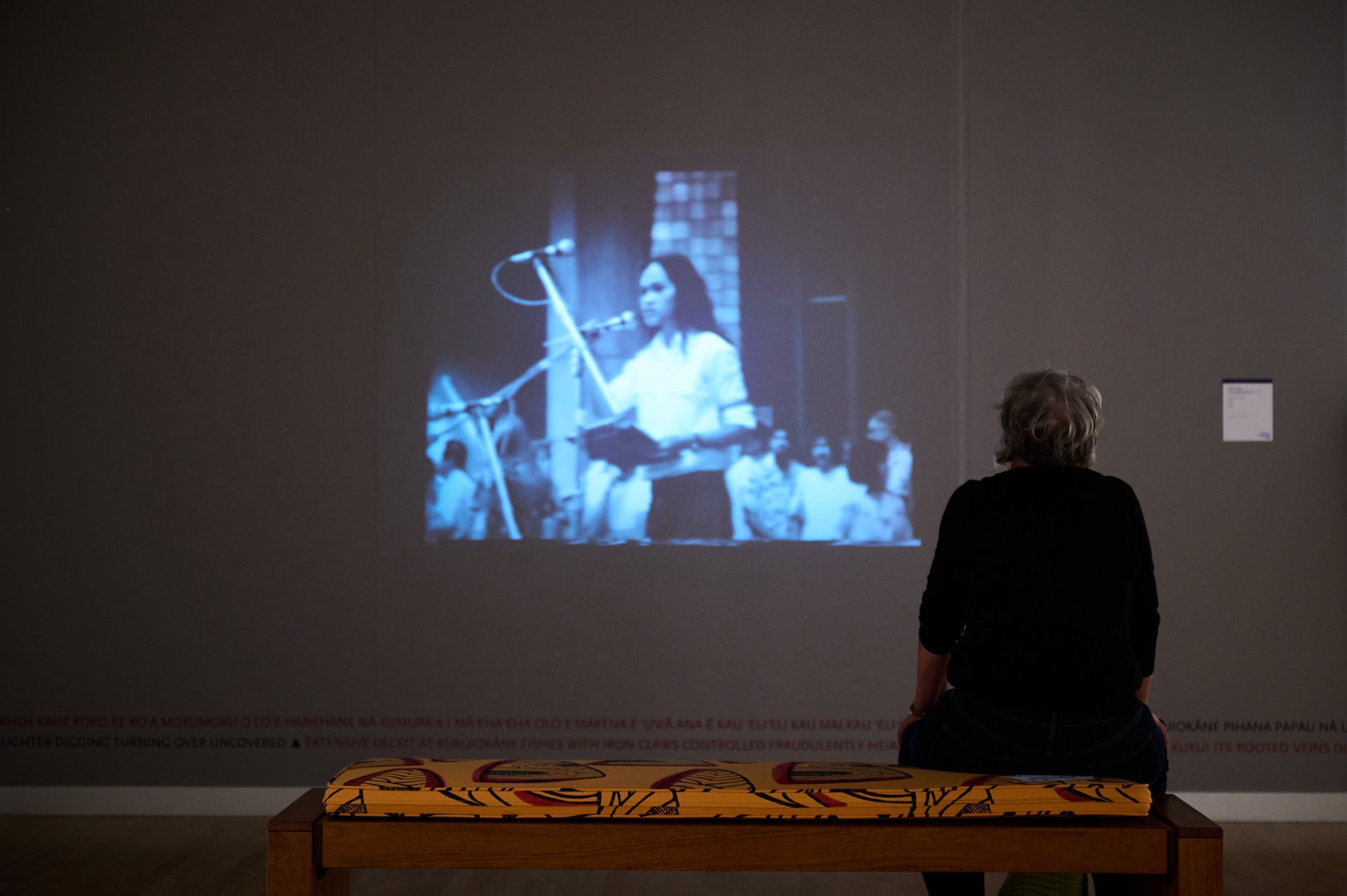 Installation view of Nā Maka O Ka ‘Āina (Eyes of the Land), a documentary series of educational videos by Joan Lander and Puhipau screening at the Hawaiʻi State Museum of Art © Nā Maka O Ka ‘Āina / Courtesy of the artists and Hawaiʻi State art Museum / Photo: Brandyn Liu
