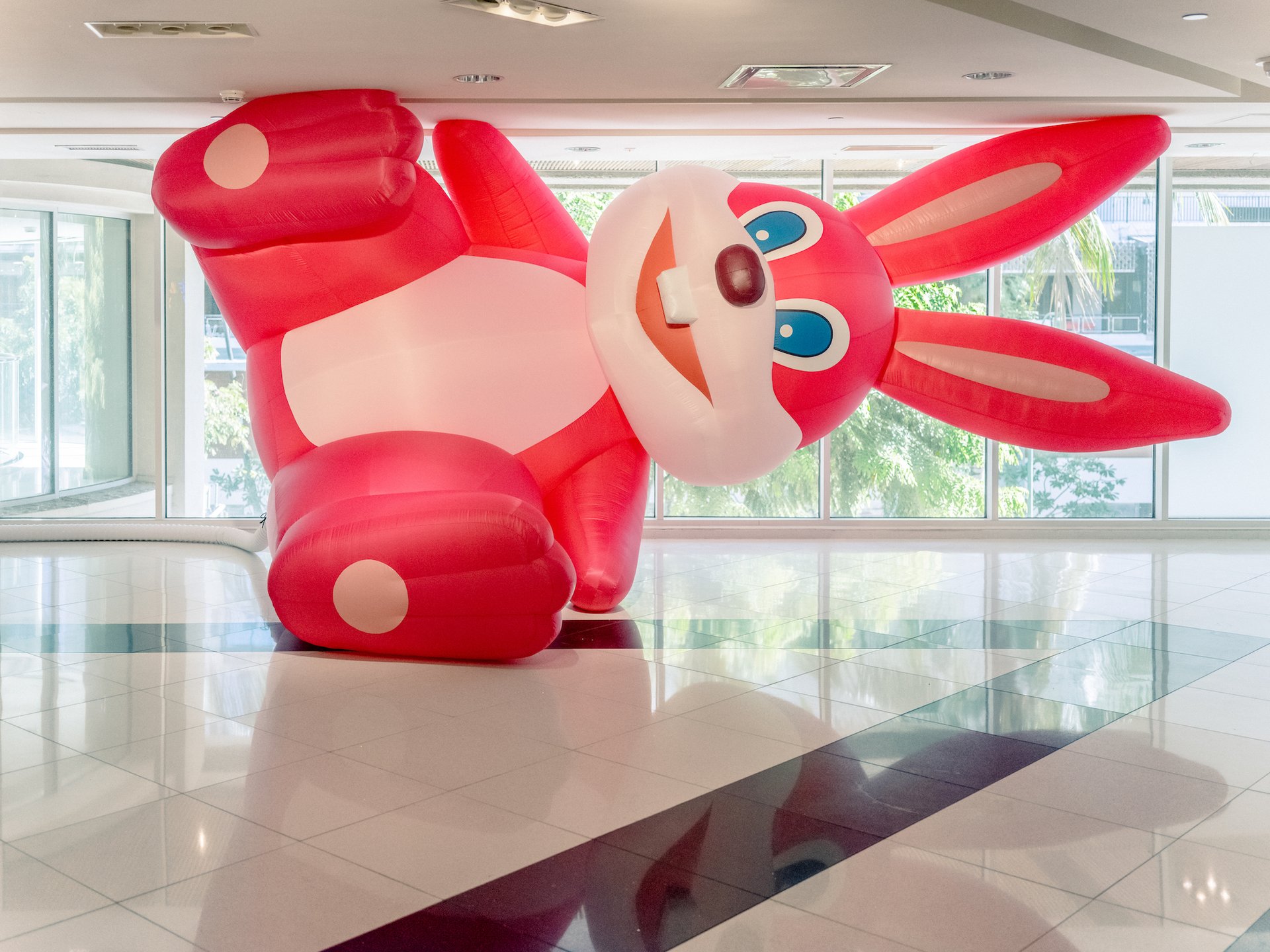 Momoyo Torimitsu, Somehow I don’t feel comfortable, 2021, nylon, air blower, sound. At the Royal Hawaiian Center, Waikīkī Courtesy of the artist and Hawai‘i Contemporary. © Momoyo Torimitsu. Photo: Lila Lee.