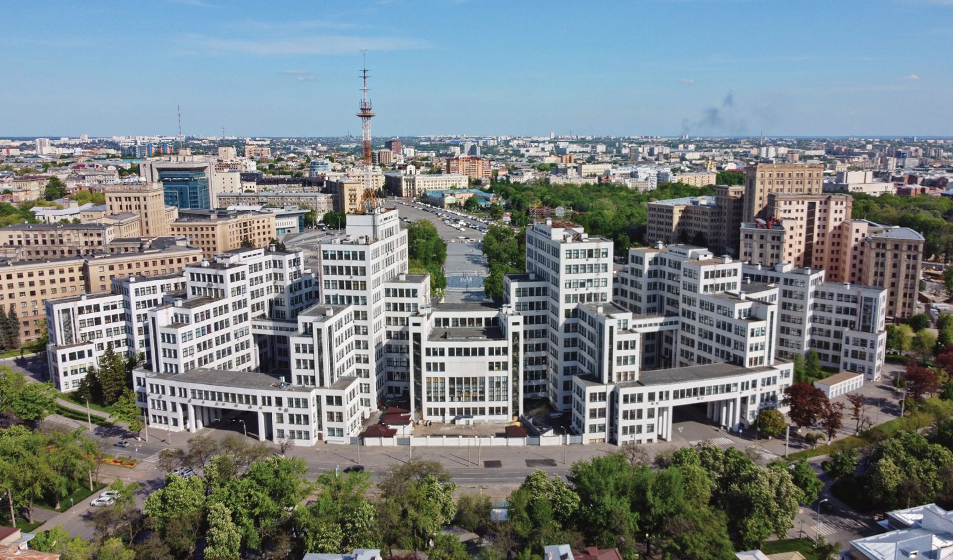 Kharkiv’s Constructivist skyscraper complex Derzhprom (House of State Industry) in Freedom Square, built in 1928, is in the zone of constant Russian shelling Photo: Oleksandr Malyon/Wikimedia Commons