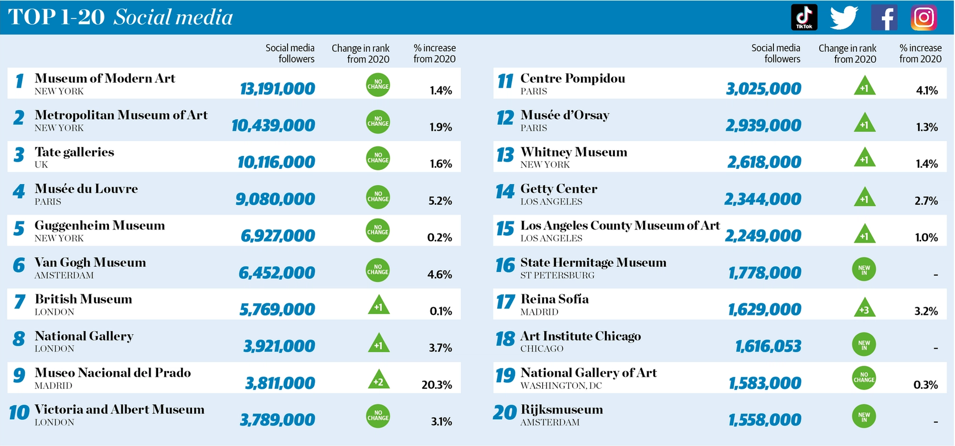 Some significant TikTok successes can be seen in the data. The Museo Nacional del Prado in Madrid has the biggest following on the platform, with more than 360,000 subscribers. Posting behind-the-scenes videos (mostly in Spanish), the museum’s TikTok credentials see it jump two spots in this year’s top 20 table. Honourable mentions for TikTok prowess also go to the National Gallery in London, the Rijksmuseum in Amsterdam and the Gallerie degli Uffizi in Florence.
