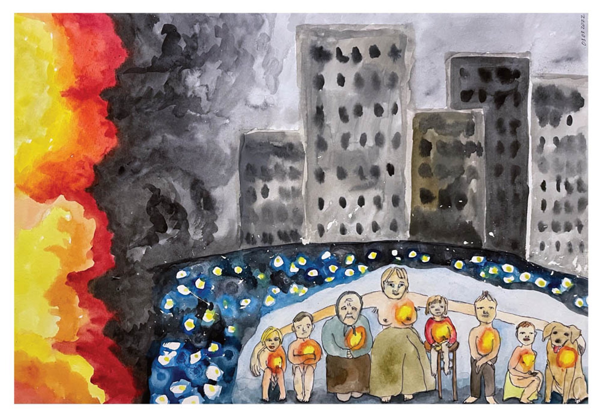 "Some of my artist friends are actively helping the war effort. Some are saving lives by helping their families and other civilians," Abramovych says. "Some had been discharged from the armed forces on medical grounds and are now involved in humanitarian relief efforts. They all hope to return to their studios. In their moments of downtime in bomb shelters, they keep sketching out new works."