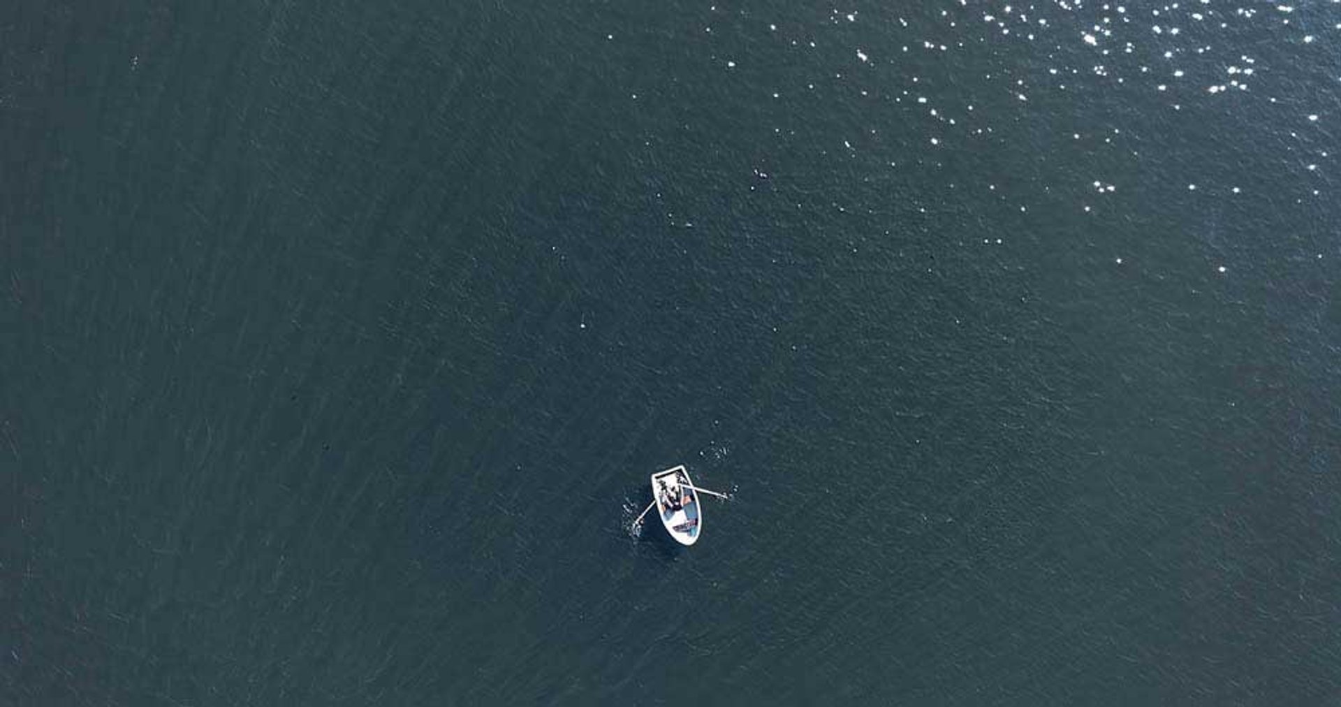 A still from Coco Fusco’s Your Eyes Will Be an Empty Word (2021), in which she rows past Hart Island throwing flowers into the water in commemoration of the thousands of nameless people buried there Courtesy of the artist and Alexander Gray Associates, New York