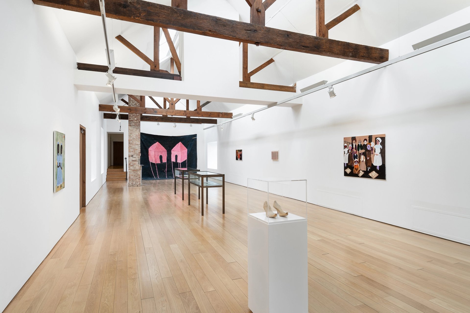 Rocha’s parade of girls (girls girls) ranges from big names to recent graduates and all that lies in between; and much of the show’s strength lies in the conversations struck up between its very various elements. The small house that sprouts from one of Bourgeois’s severed arms not only references the claustrophobic hybrid femme-maisons that have cropped up in her work from the 1940s, but here also reverberates in the 20-something British artist Sophie Barber’s giant painting of a pair of pink houses that covers the entire back wall of the main gallery. Teetering precariously on spindly stilts and looking more like an odd couple than two pieces of architecture, his huge dangling tarpaulin-canvas sends out mixed messages about hearth, home and relationships as well as providing a bold backdrop to the show.