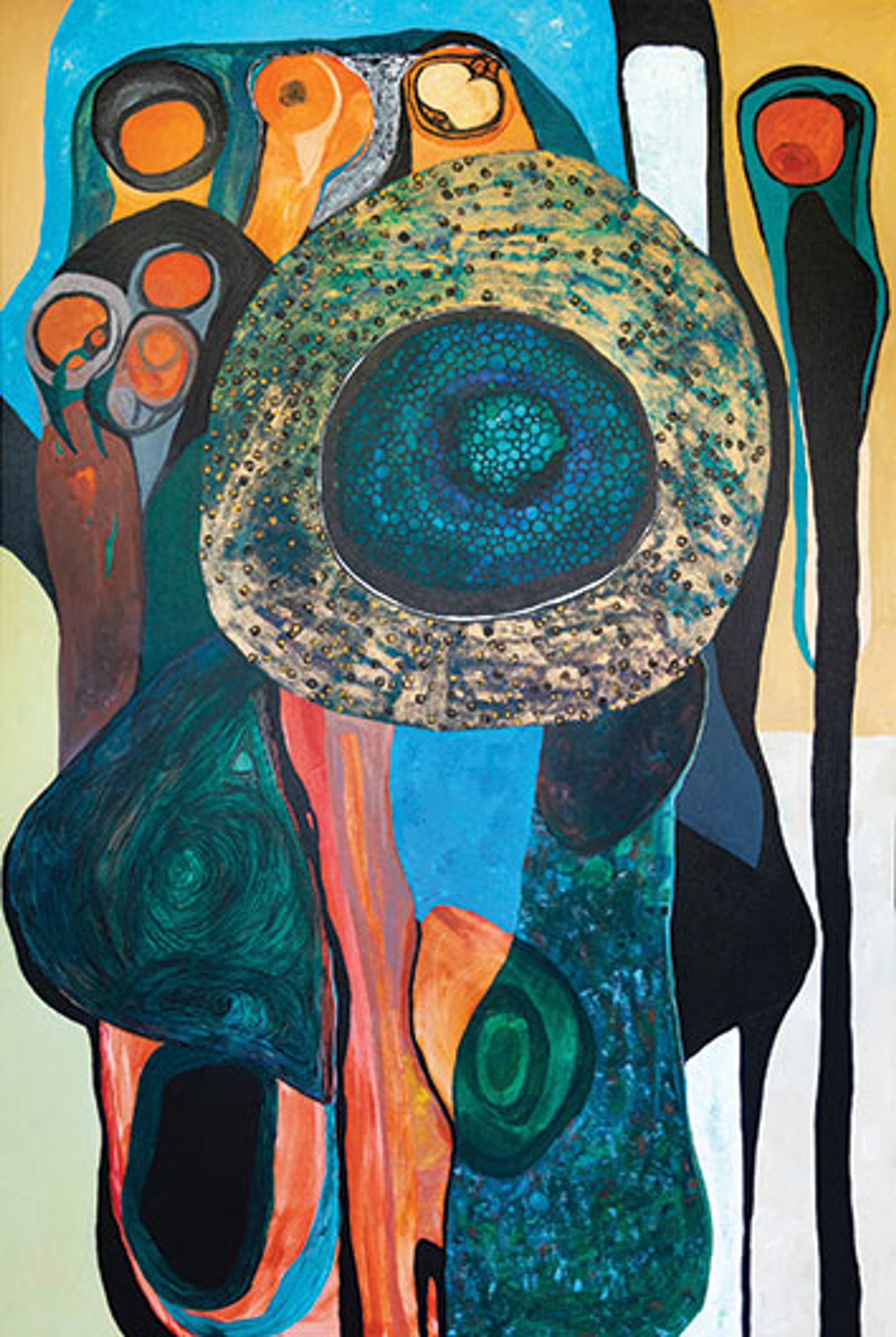 Alemani cites Berhanu as an example of artists who create “new forms of symbiosis between animals and human beings”, crafting “narratives that interweave environmental concerns with ancient chthonic deities, yielding innovative ecofeminist mythologies”. The Ethiopian artist, who now lives in Maryland, makes paintings that appear abstract at a distance, but clearly contain bodily aspects, as well as forms that suggest both landscapes and cellular organisms. Berhanu has said that her work evokes the rupture of her emigration to the US.