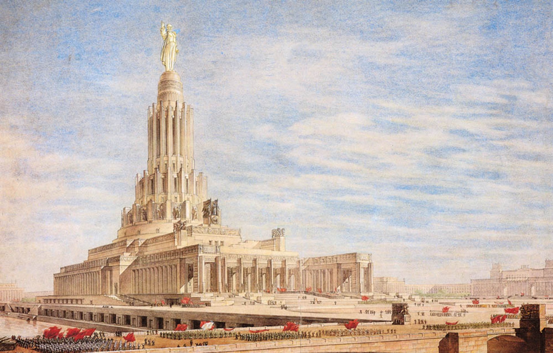 One of Boris Iofan’s many designs for the unbuilt Palace of the Soviets, topped by a giant statue of Lenin and planned for the centre of Moscow © Album/Alamy Stock Photo