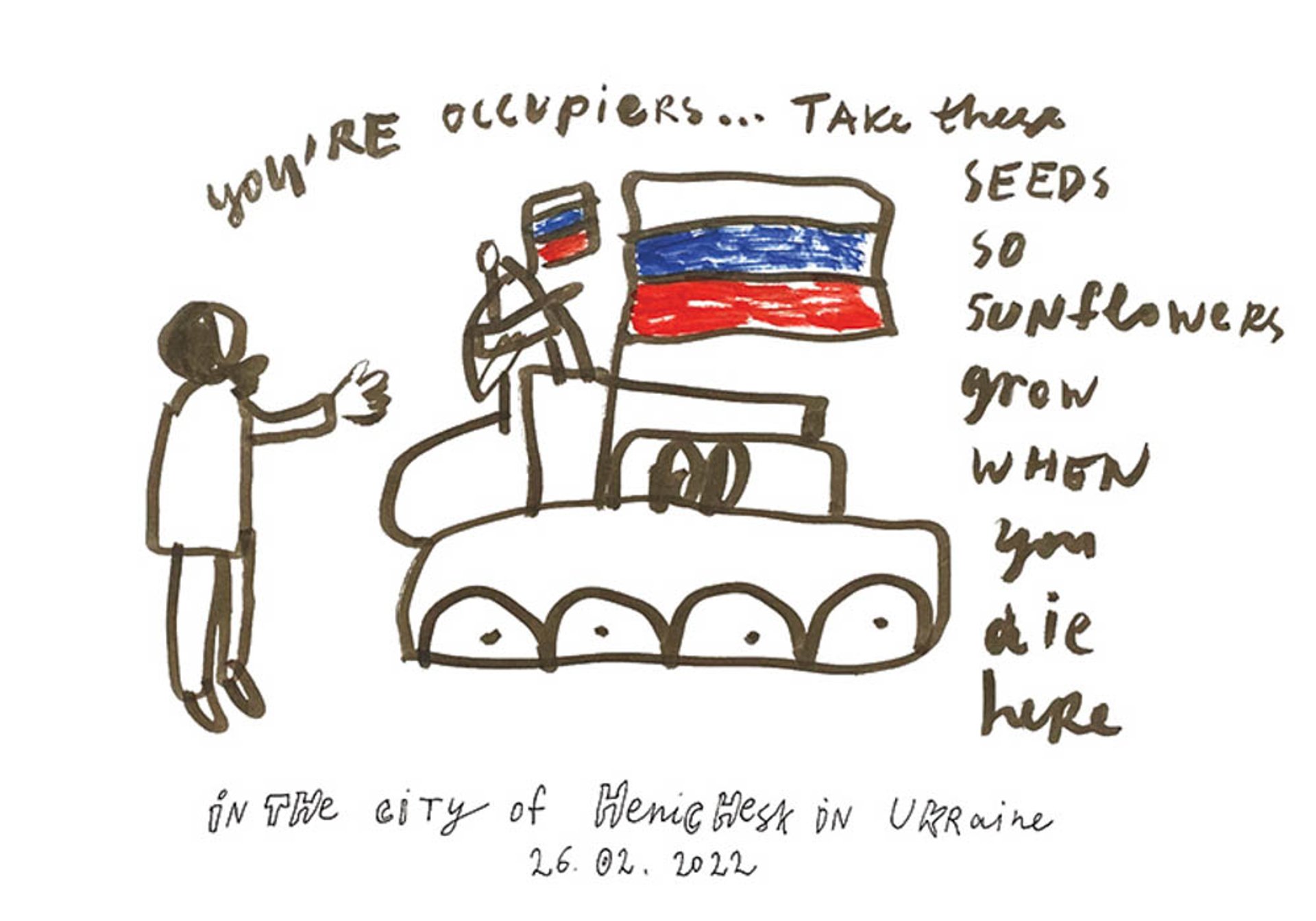 A drawing by Alevtina Kakhidze, made two days after the Russian invasion