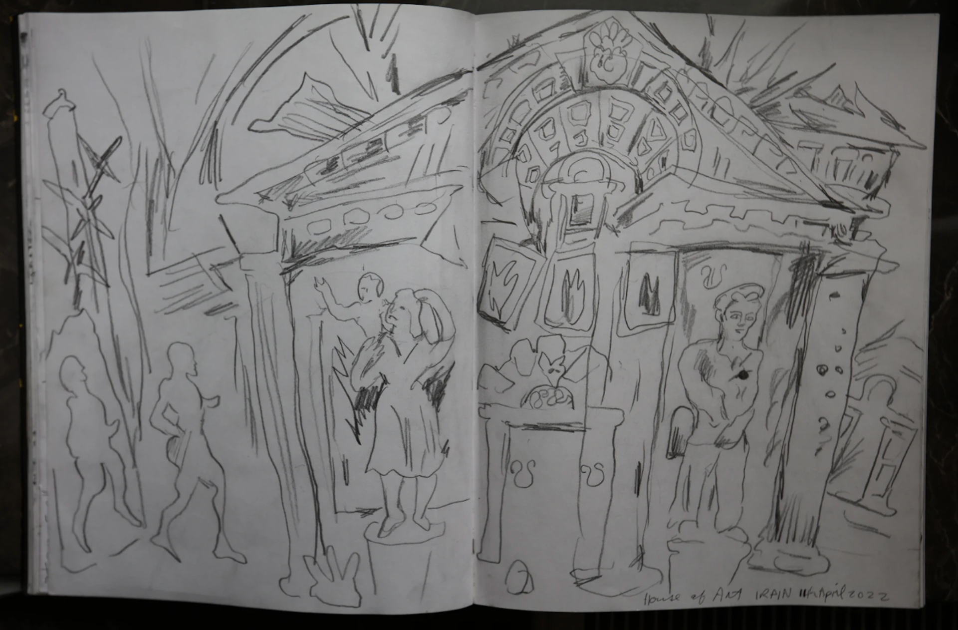 George Gittoes's drawing in which he records the destruction by Russian forces of the Central House of Culture in Irpin © George Gittoes