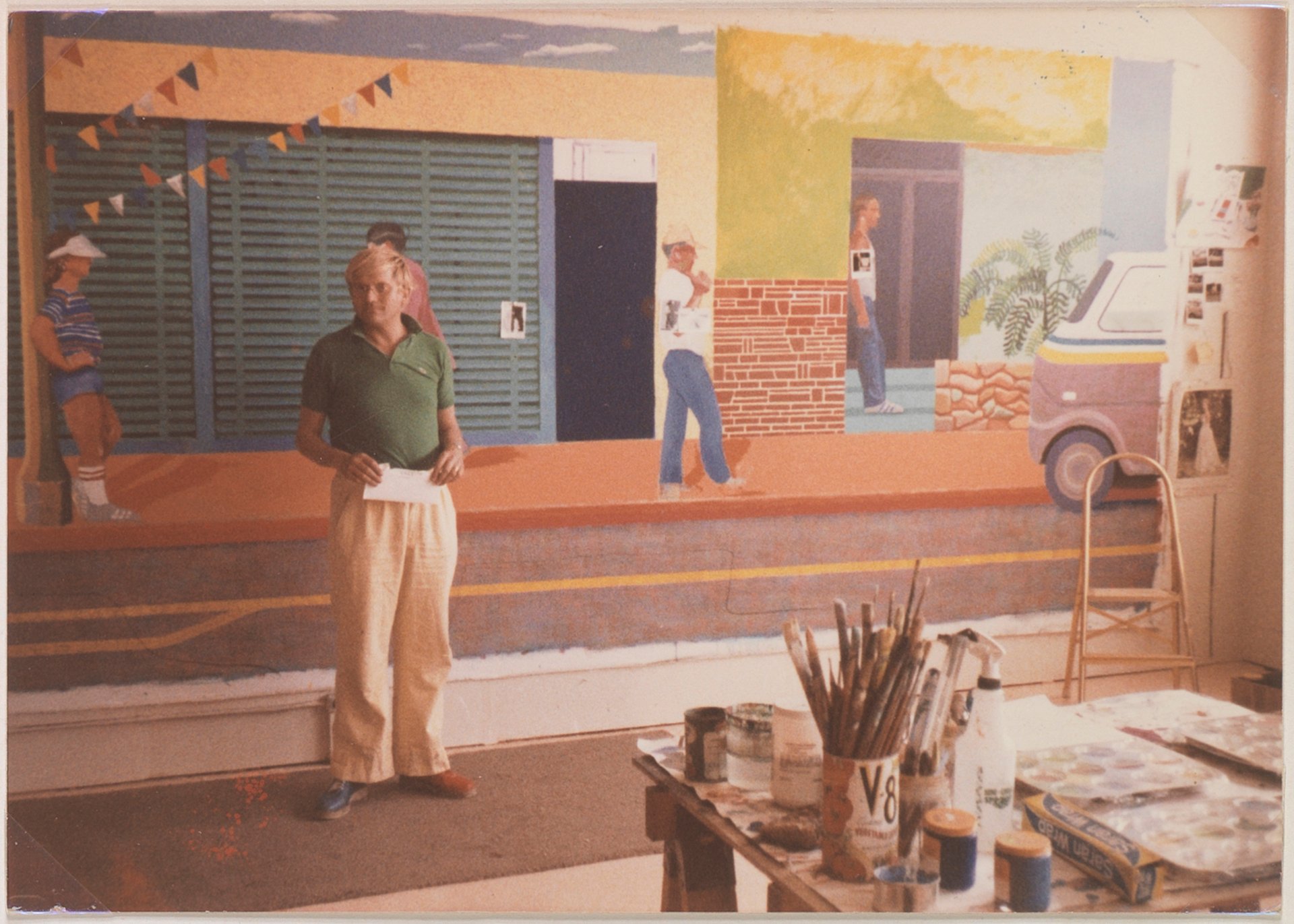 David Hockney working on Santa Monica Boulevard in his studio, West Hollywood, California, around 1978-80.
