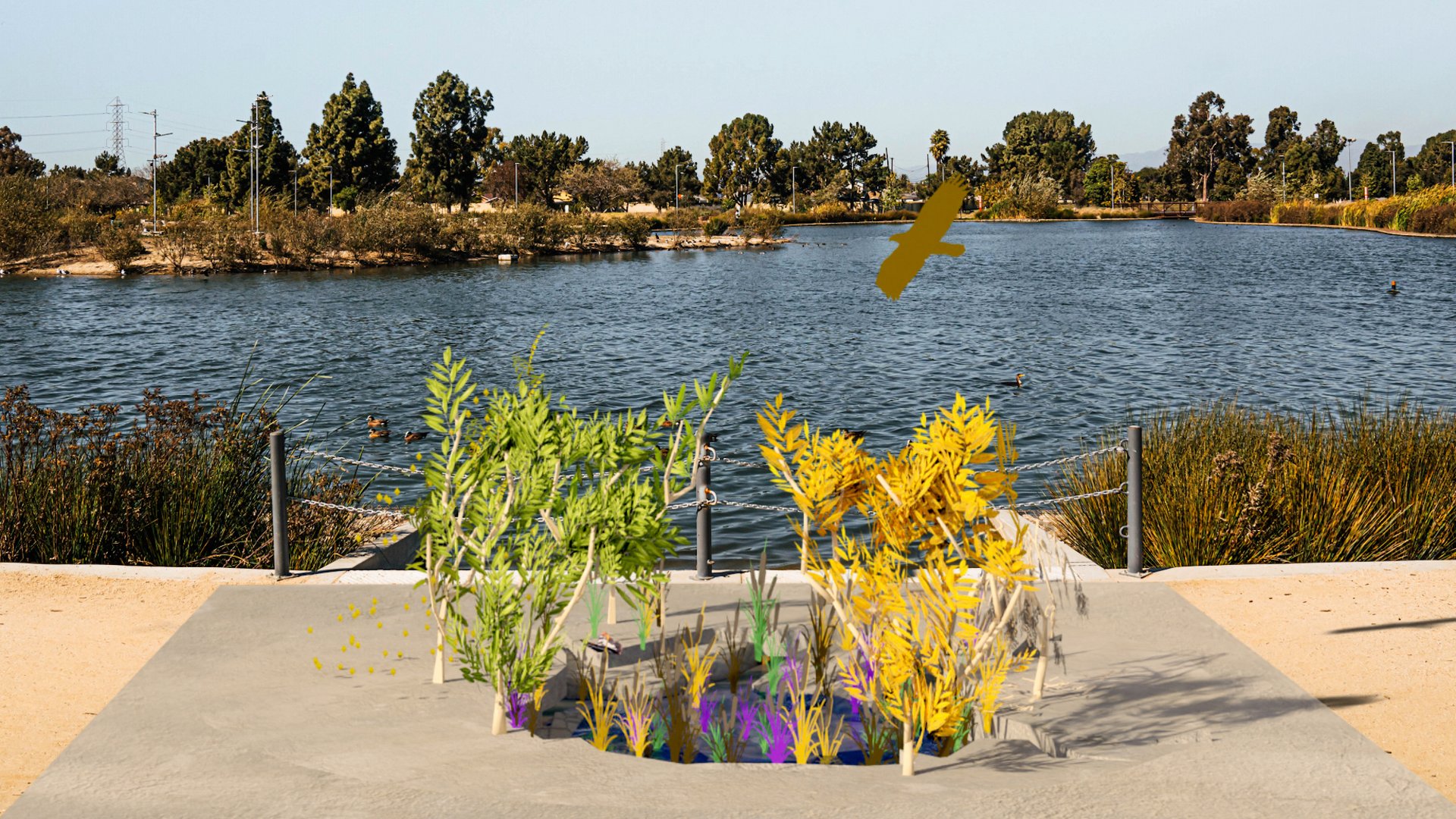 The project is a good fit for someone like de la Loza who considers herself “a research-based artist who investigates histories”, who has given much thought to monuments and has previously created site-specific works. In What the Willow Whispers, at Earvin “Magic” Johnson Park, the pavement breaks open to reveal an outpouring of native plants and animals from an earlier Los Angeles. Featured in the animation, she says, is “the willow tree that would have grown alongside Compton Creek, which passes nearby and ran through the community, so I pay homage to erased native ecosystems”. She adds, “I try to make visible the underlayers of the built environment.”