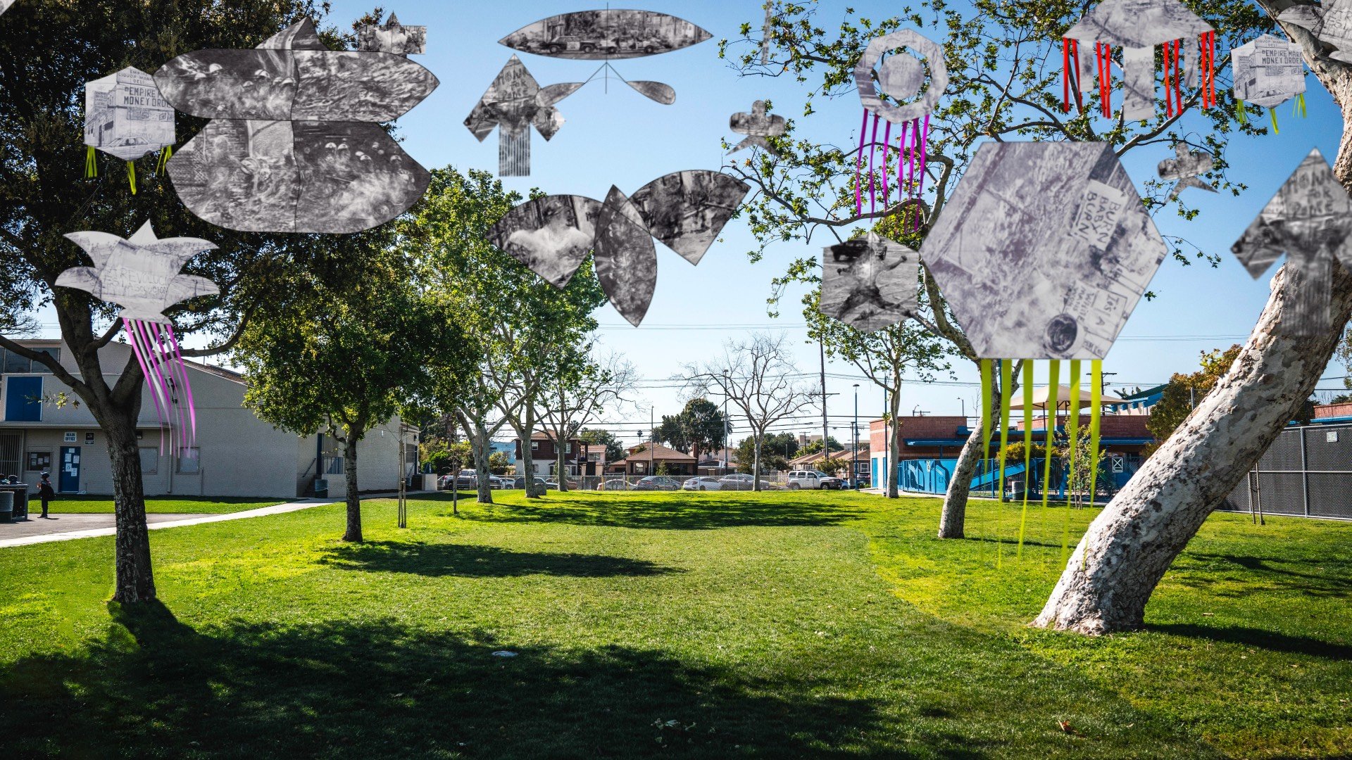 Lee’s work, la revolución es la solución, has more contemporary references, specifically to the 1991 killing of Latasha Harlins by a Korean American storeowner and its aftermath. Using animated kites floating in the sky at the Algin Sutton Recreation Center, he attempts to turn our attention to activists who have worked to rebuild communities. Harlins grew up frequenting the playground there, which was renamed in her honour last year.