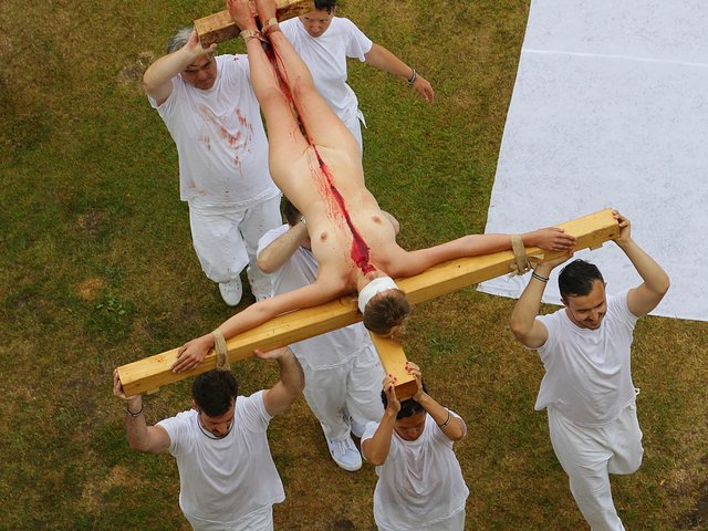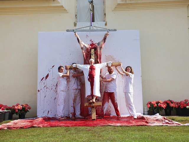 "With his Orgies Mysteries Theatre, Hermann Nitsch created a unique cosmos, a great cultural collage, superimposing religions and myths on top of one another and fusing all the arts, a true Gesamtkunstwerk that will stand the test of time," says Roman Grabner, a curator at the BRUSEUM-Neue Galerie Graz who served as a consultant on the new Venice exhibition.