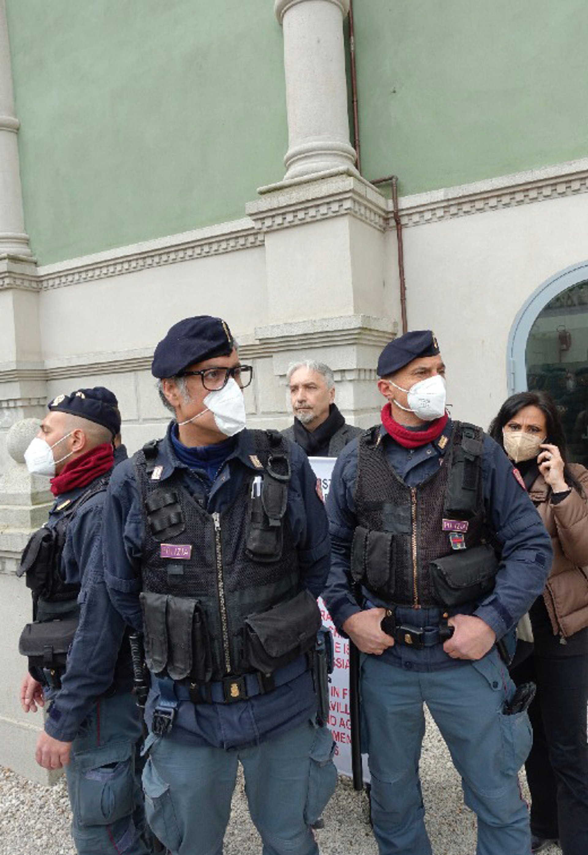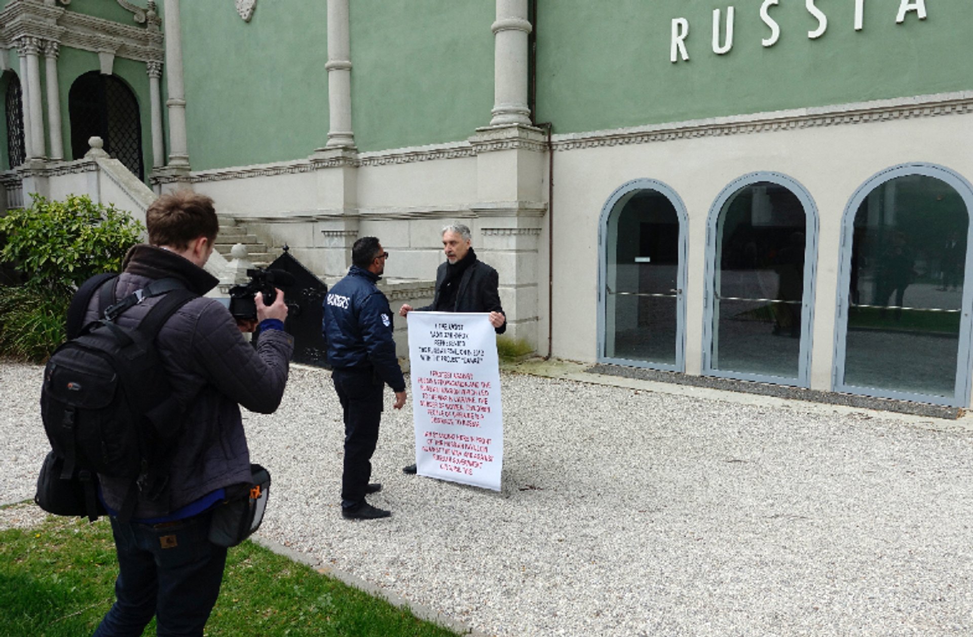 Zakharov staged his protest outside the Russian Pavilion yesterday but was eventually removed by the Italian police. “They blocked me,” he says. “It took a while for them to establish who I am. They took away [my protest] poster and a leaflets [with my statement].” He was then released by police. He adds in a statement that “everyone must decide for themselves how to behave in relation to the war in Ukraine which began in 2014 and reached its bloody climax in 2022”.