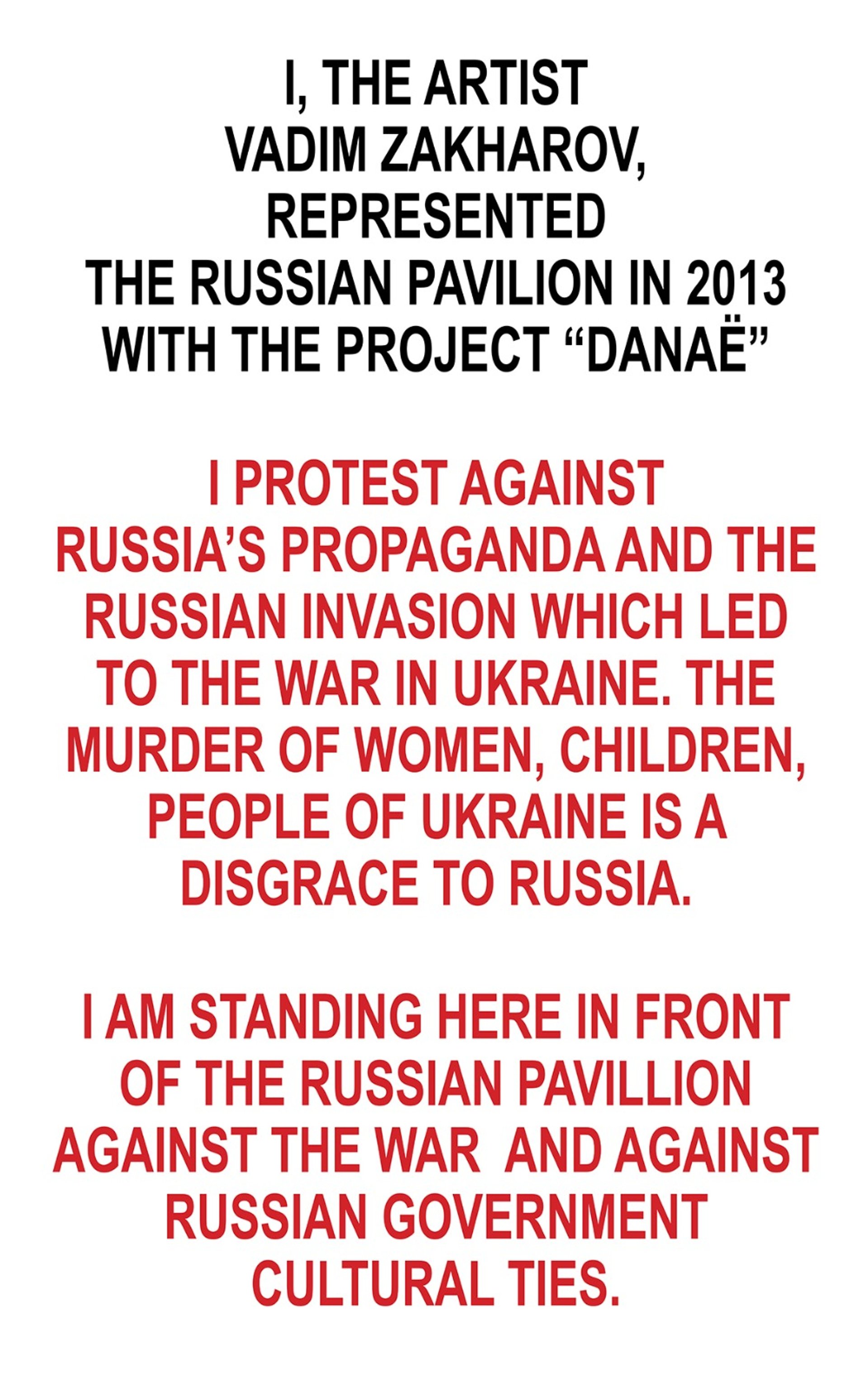 The Russian artist Vadim Zakharov launched a protest at the Venice Biennale yesterday. He displayed a protest banner outside the Russian pavilion in the Giardini declaring that “the murder of women, children, [and] people of Ukraine is a disgrace to Russia”. Zakharov represented Russia at the Biennale in 2013 when he showered visitors to the pavilion with gold coins. “I am standing here in front of the Russian Pavilion against the war and against Russian government cultural ties,” the banner said.