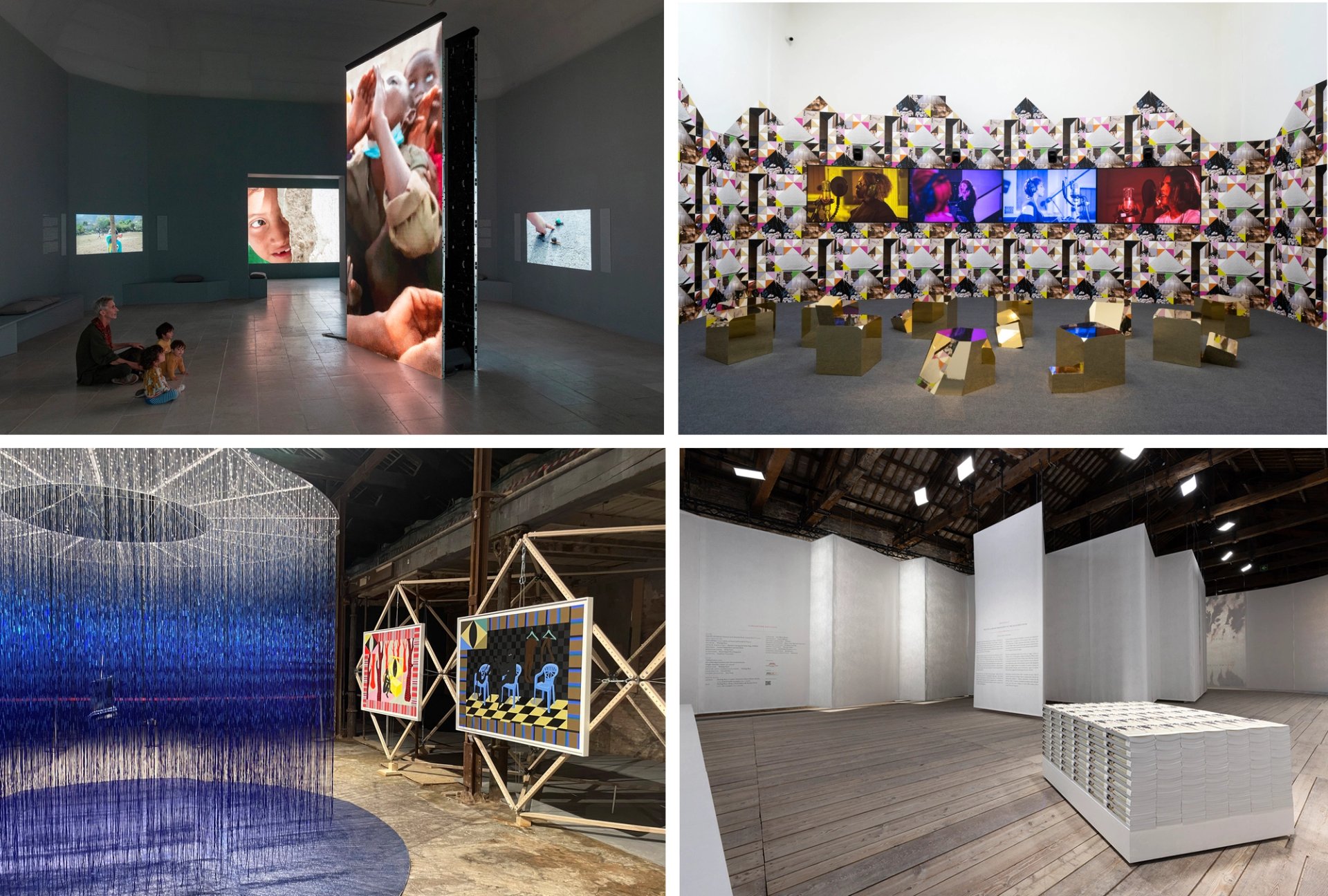 Clockwise from top left: The Nature of the Game by Francis Alÿs for the Belgian Pavilion; Room 1 in Sonia Boyce's British Pavilion; Shubigi Rao's Pulp III: A Short Biography of the Banished Book in the Singaporian Pavilion; Na Chainkua Reindorf's works in the Ghanian Pavilion show Black Star, The Museum as Freedom Belgian Pavilion: Roberto Ruiz; British Pavilion: Cristiano Corte © British Council; Singaporian Pavilion: Alessandro Brasile; Ghanian Pavilion: Aimee Dawson