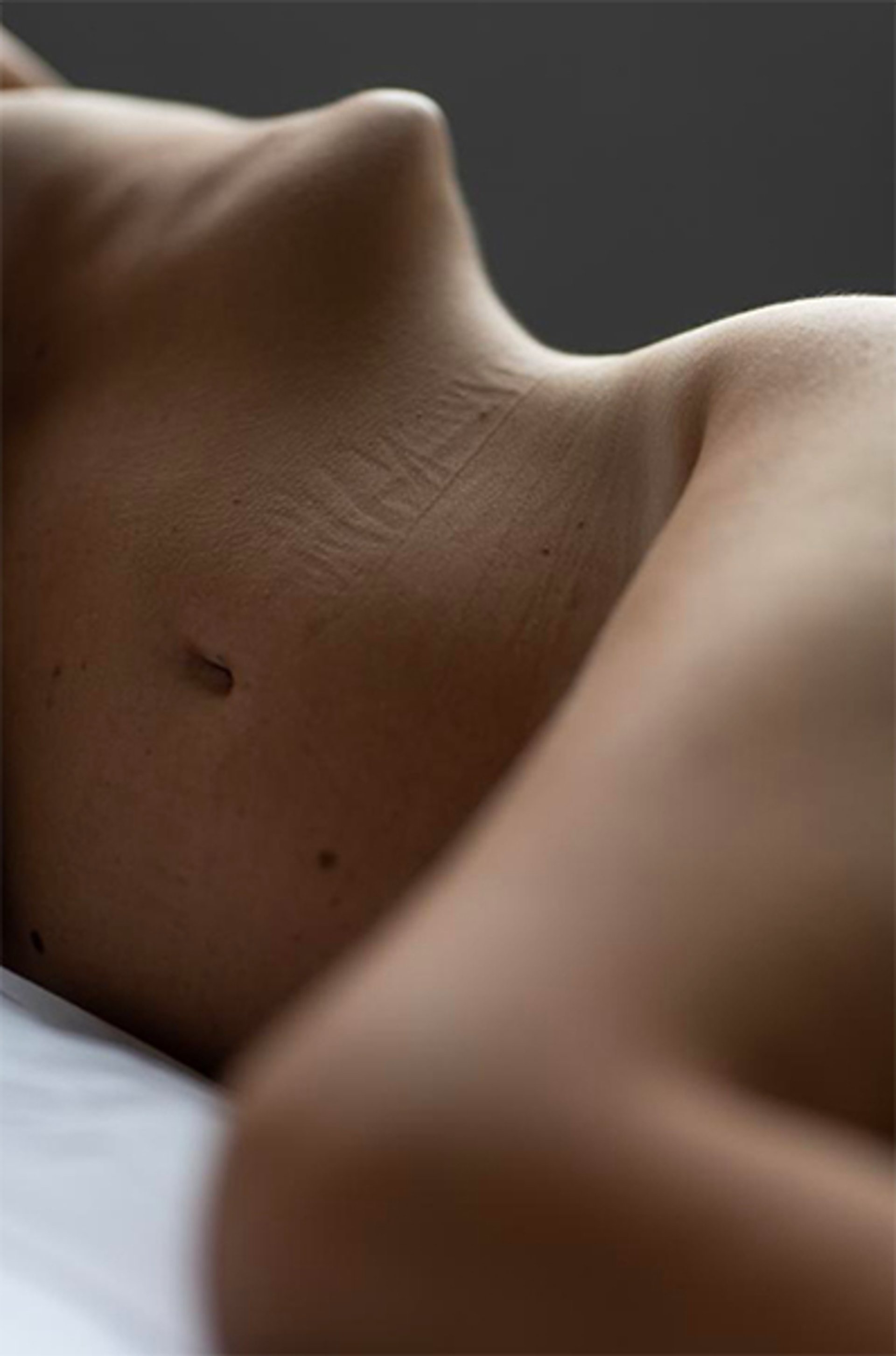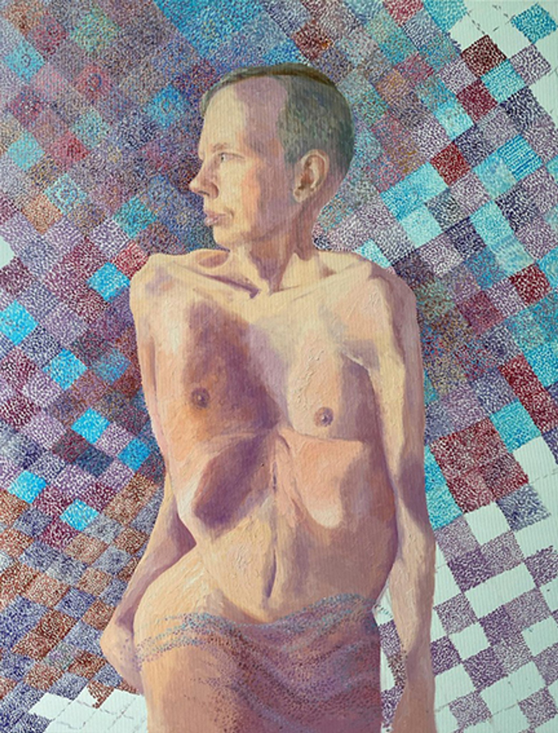 With shades of pink, blue, and grey, and often using pointillism, Litvinova's figurative oil paintings are tender depictions of her own body and her husband's body. Wanting to take the same mission into the realm of photography, yet physically unable to work with a camera herself, Litvinova searched for a photographer with whom she would capture her nude body. She found fellow Odesan Vitaly Rushinksi online. "I met up with him for a coffee and we discussed the concept of the photoshoot, making sure we were on the same page," she says. In December last year, they rented a studio. "The male gaze was important for me, because, while feminism has achieved a lot, commercial culture is still very powerful, and the pressures of an ideal body are still great," Litvinova explains. The experience was empowering for her. "When I saw the photographs, I felt proud that I did not fear the camera, that I can fight for the acceptance of my body and my illness." Next, Litvinova wants to continue the series by working with photographers on the nudes of other people with disability: her husband, friends, and others.