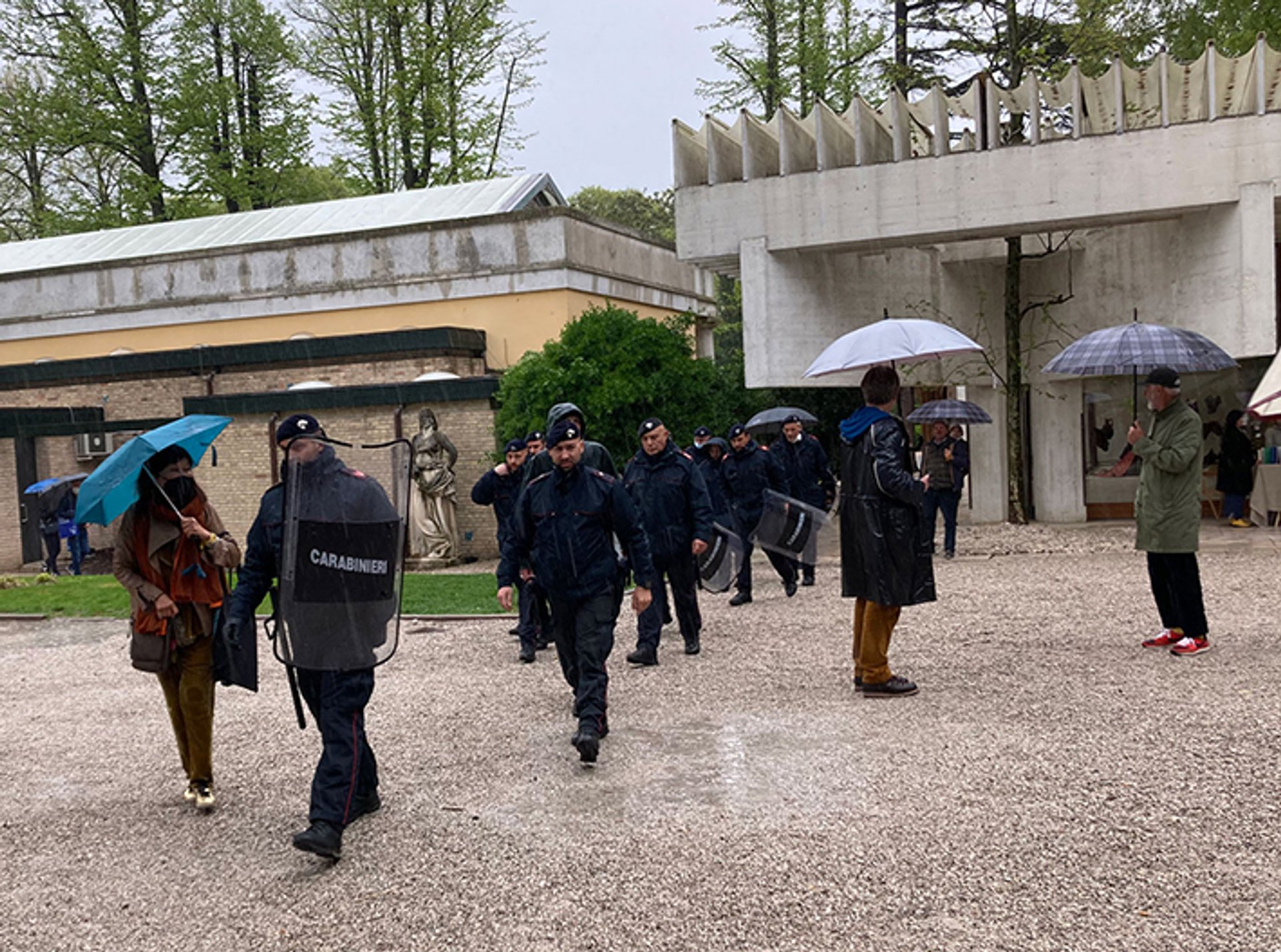 The Russian pavilion is closed for this edition of the Biennale after the artists and curator pulled out following the invasion of Ukraine. The empty pavilion has been patrolled each day by an armed guard.