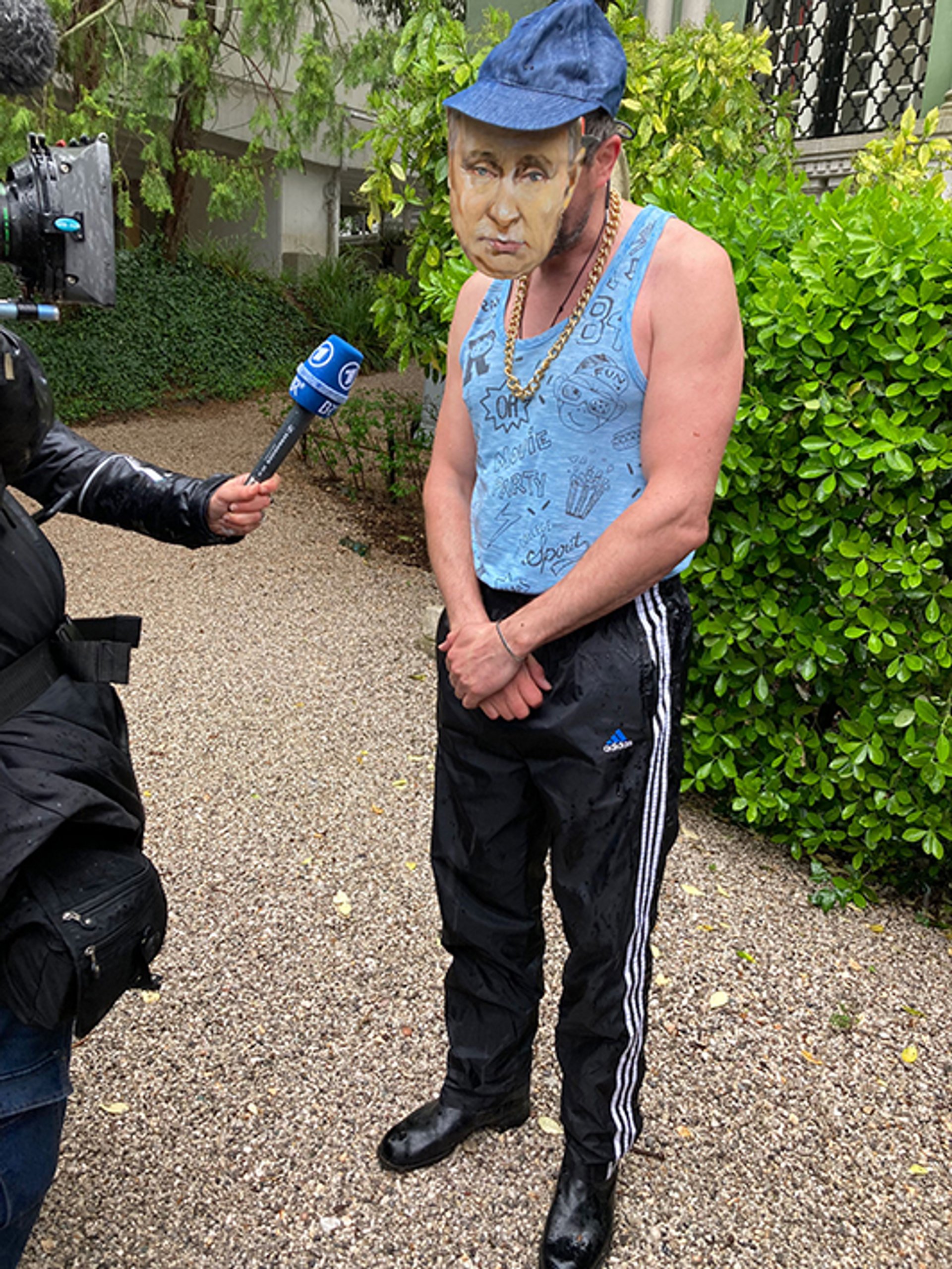 Yudnikov spoke in English and Russian, referencing Nikolai Gogol’s 1836 satirical short story The Nose, and eventually opened his overcoat to reveal a mask of Putin over his crotch. He returned to the bushes for an outfit change before re-emerging dressed as a thug in a vest and gold chain wearing the Putin mask on his face. Despite attempts by local officials and police to interrupt the performance, Yudnikov managed to change back into the dark figure based on the fictional French criminal anti-hero Fantômas, which was popular in Soviet Russia.