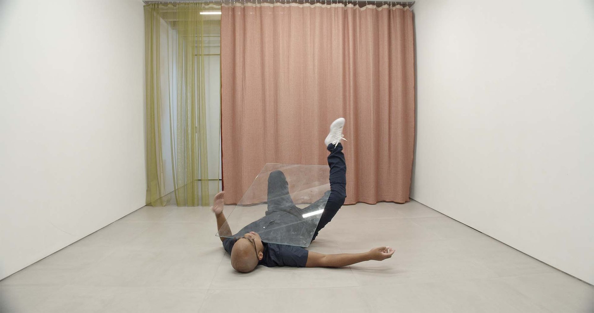 Shot in a small room with white walls and one dusty rose-accented one, with a wooden desk in the background and sheer yellow and pink curtains, the 33-minute video shows the artist contorting his body and performing mysterious actions with various utilitarian objects such as a piece of plexiglass, a chair and a laundry bag. At one point, viewers see the artist trying to escape from the closed laundry bag. As McKenzie struggles to free himself, he creates various shapes and movements within the confined space. The video situates his work in a larger history of endurance-based performance.
