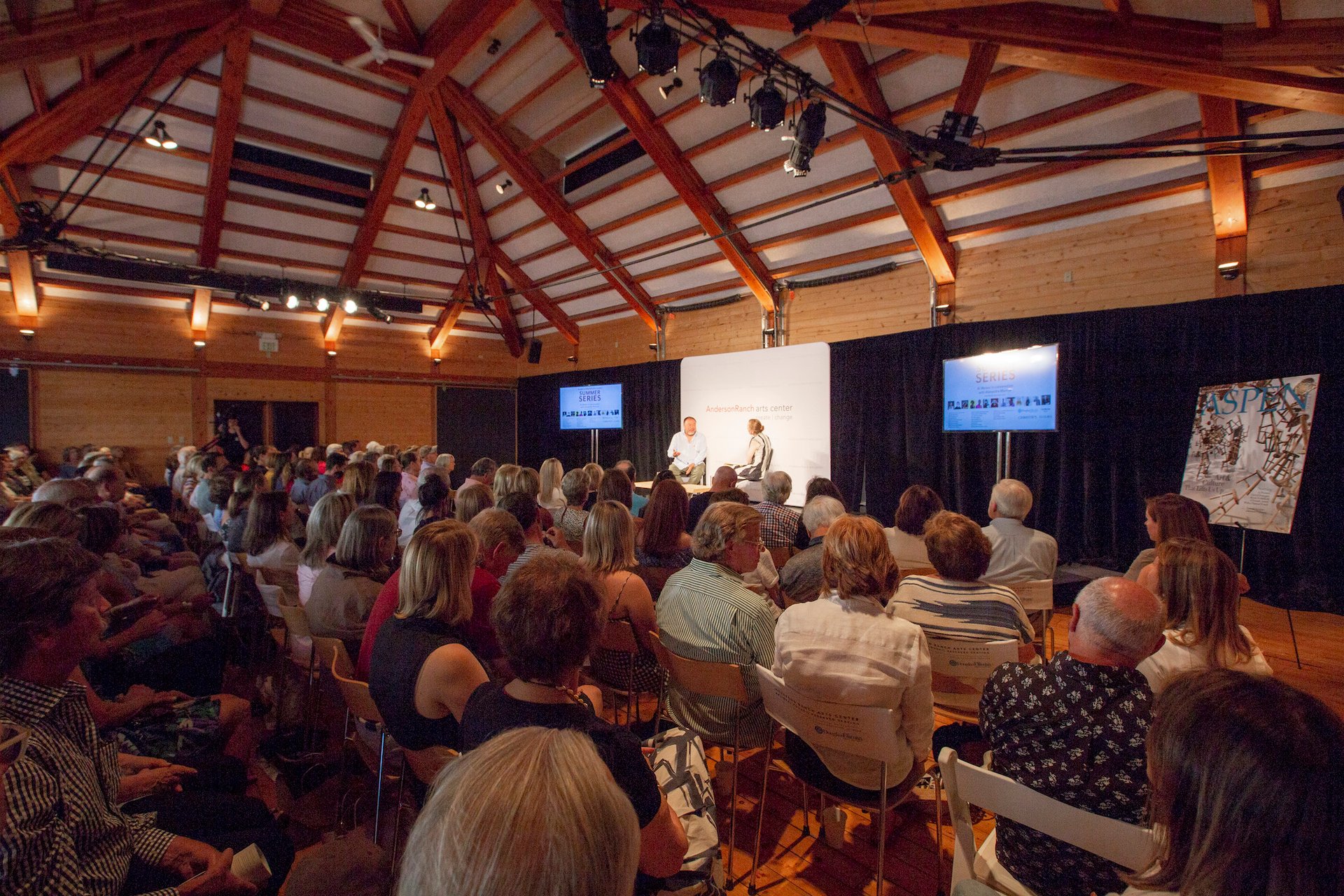 Ai Weiwei speaks in Schermer Meeting Hall at Anderson Ranch during the 2018 Summer Series Courtesy Anderson Ranch Arts Center