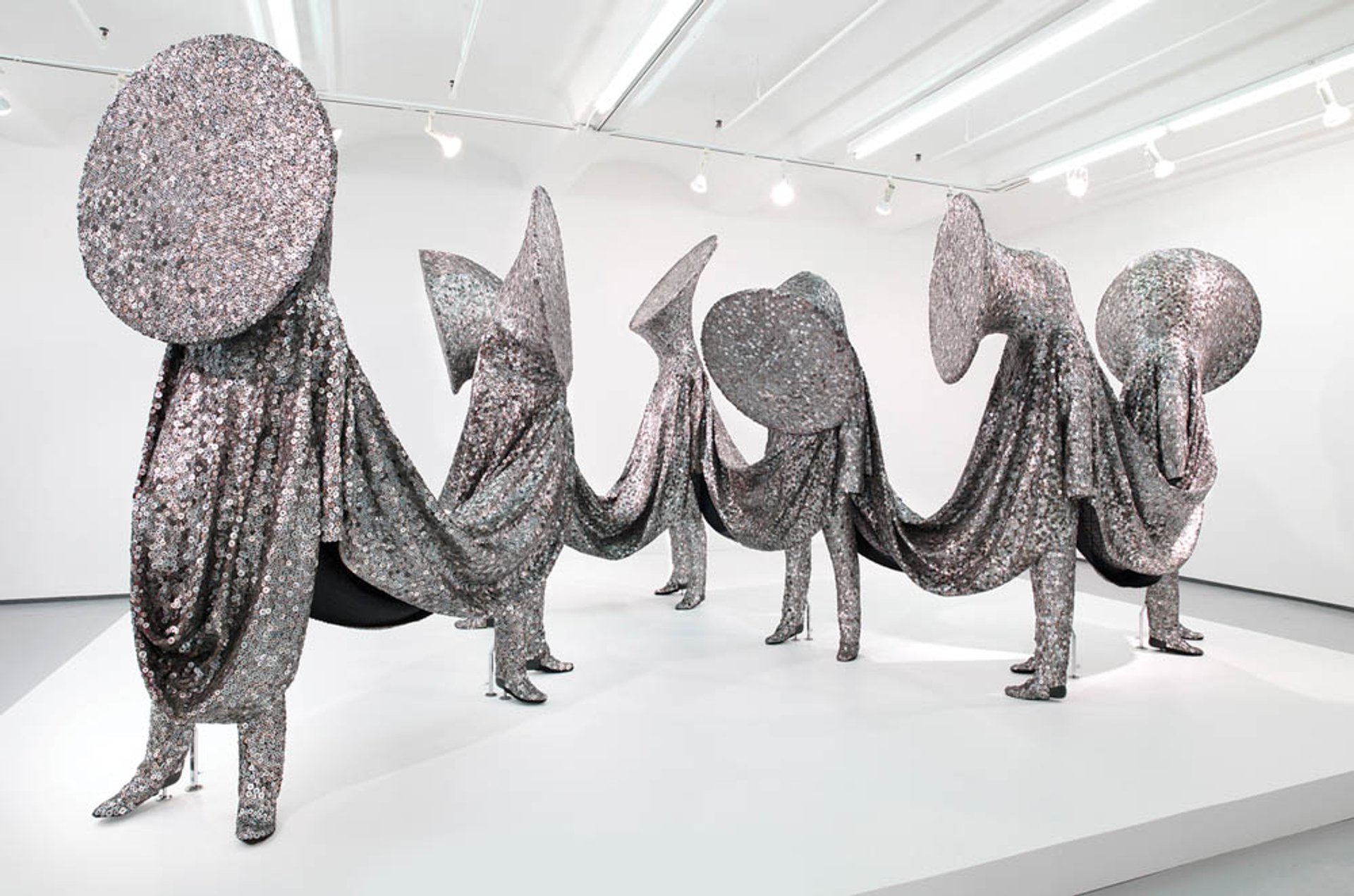 Speak Louder (2011), made from materials including black mother-of-pearl buttons and metal armature, gathering seven of the artist’s signature Soundsuit sculptures. Cave created his first Soundsuit in