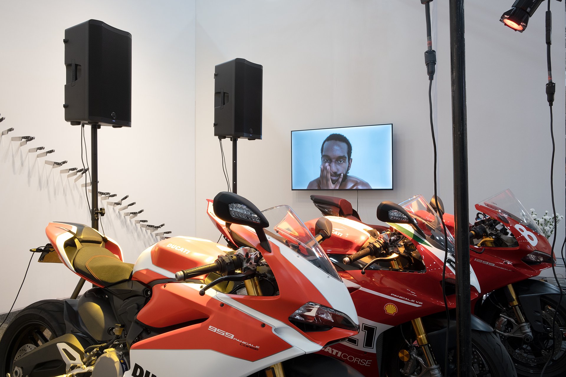 Among the most dynamic solo presentations at the fair, this dramatic booth shows an installation by the New York-based artist and dancer Elliot Reed comprising motorcycles, large speakers, theatre lights and a series of knives embedded in one wall, while a video work and photographs highlight the performative facet of his practice. The conceptual work is a miniaturised version of Reed’s exhibition at the Kunsthaus Glarus in Switzerland last year, which occupied two floors of the institution. The artist has described the visually atmospheric work as “a metaphor”, or an “encounter with an unsolvable problem”.