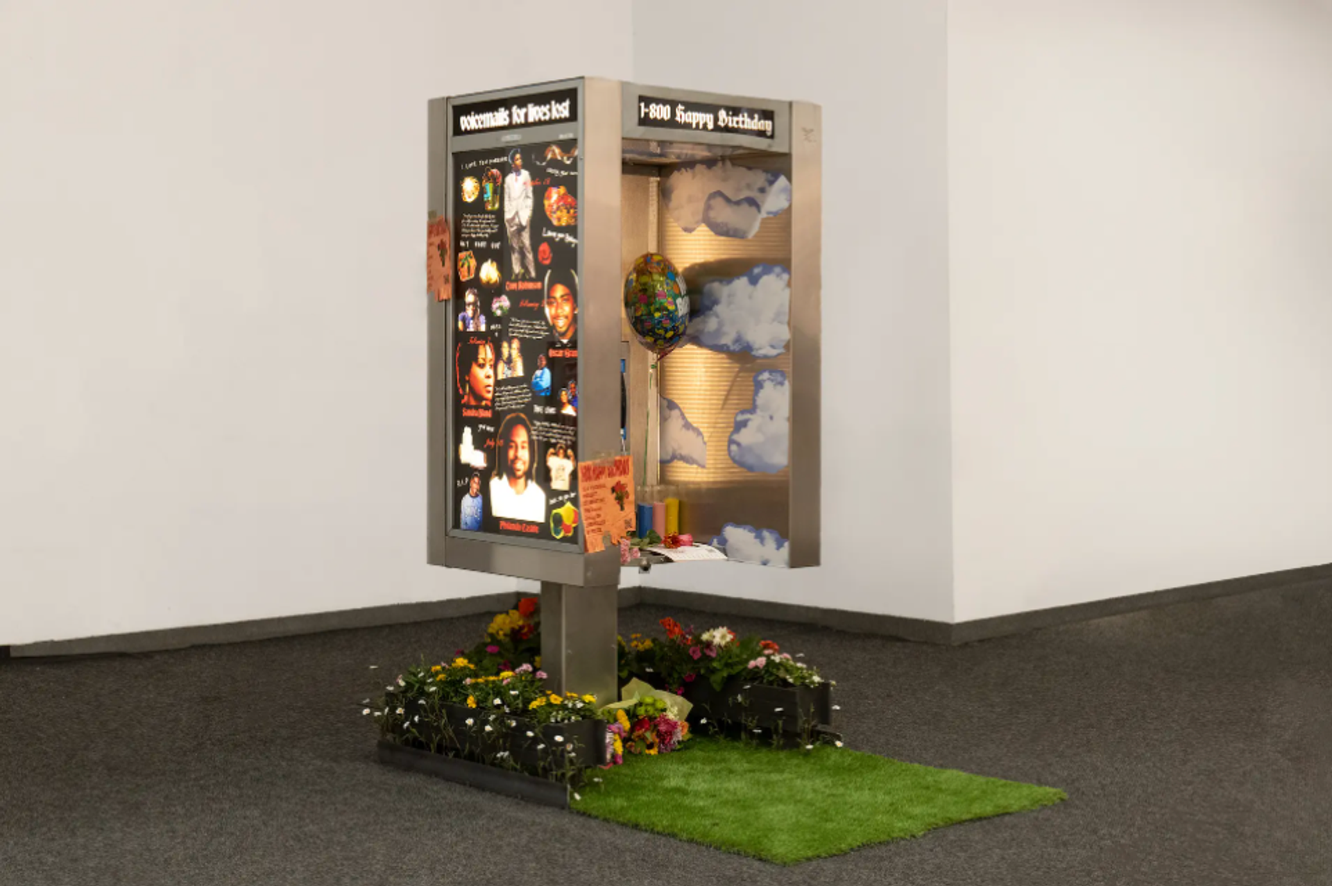 One of the first works visitors see when entering the fair, this installation expands on an ongoing digital project created in 2020 by the art collective Even/Odd to honour Black Americans who have been killed by the police. Standing over 7 ft tall and weighing over 500 pounds, the upcycled phone booth acts as a physical monument for the lives lost. The phone booth plays moving voicemails from relatives and friends of those killed, recalling past birthdays and how they would celebrate if the person were still alive. The work will be expanded into a standalone exhibition at the gallery’s space in Brooklyn in September.