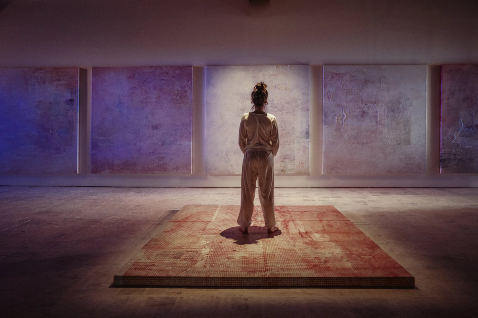 The Minimum is a performance devised in collaboration with the choreographer Alethia Antonia and the composer Lily Oakes. The work comprises a painted installation roughly the size of a solitary confinement cell, which usually measure around six feet by nine feet. El-Sayegh’s “cell” is made from canvases drawn from the artist’s White Grounds paintings, a series of densely layered works incorporating found fragments such as pages from the Financial Times.