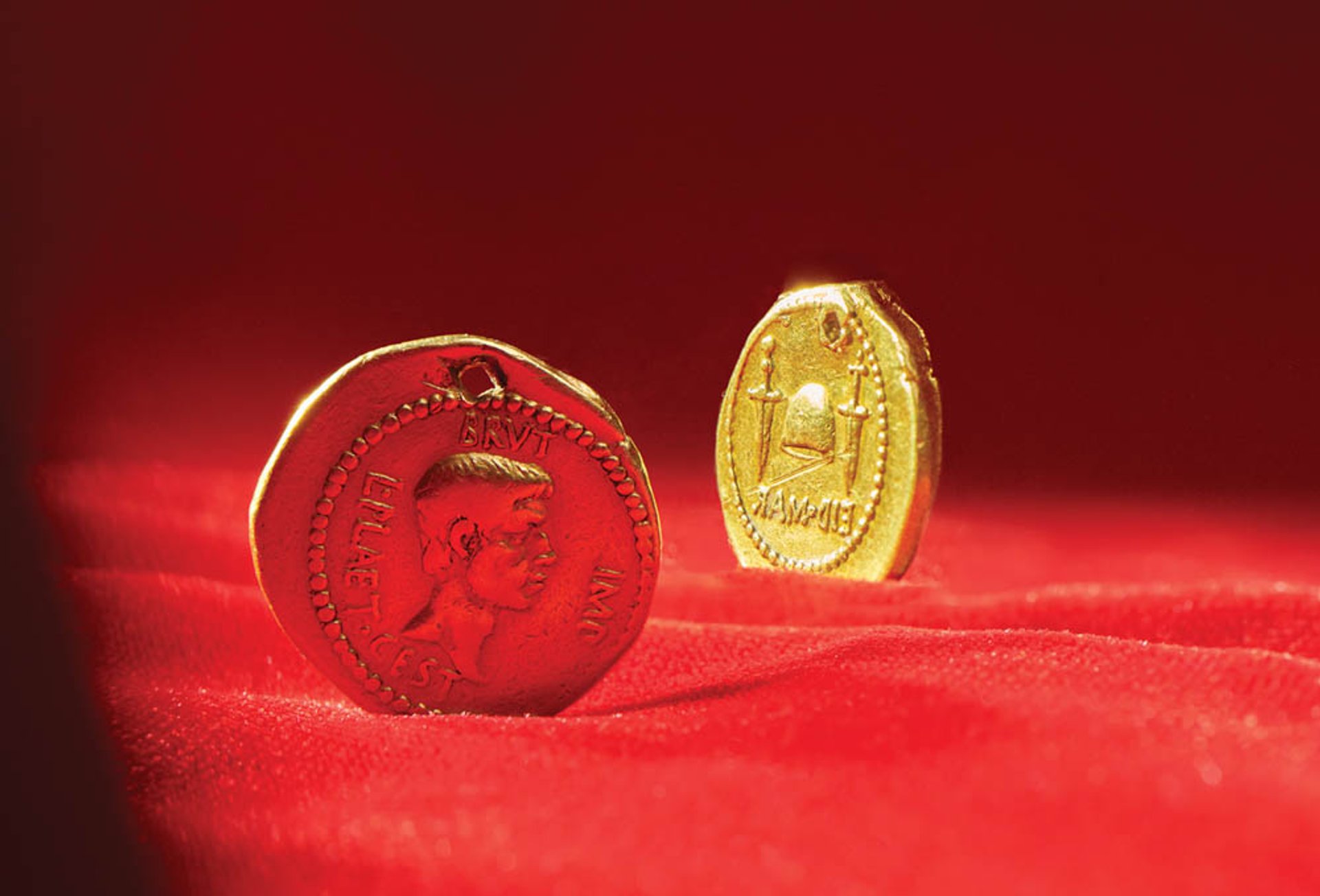This ancient gold coin is possibly one of the grimmest souvenirs to come up for auction in recent memory. According to the rare-coin auction house Numismatica Ars Classica, the coin was minted by Marcus Junius Brutus to commemorate the assassination of Julius Caesar—and it is rumoured that it was worn by one of assassins. Known as the “Eid Mar” (Ides of March), the coin is one of only three gold examples to exist and has been on loan to the British Museum for the past decade. The head features a bust of Caesar’s once friend and betrayer Brutus surrounded by an inscription that distinguishes him as an “acclaimed military victor”. The reverse shows two daggers, meant to represent Brutus and his co-conspirator Cassius, bookending a cap that symbolises the liberation of