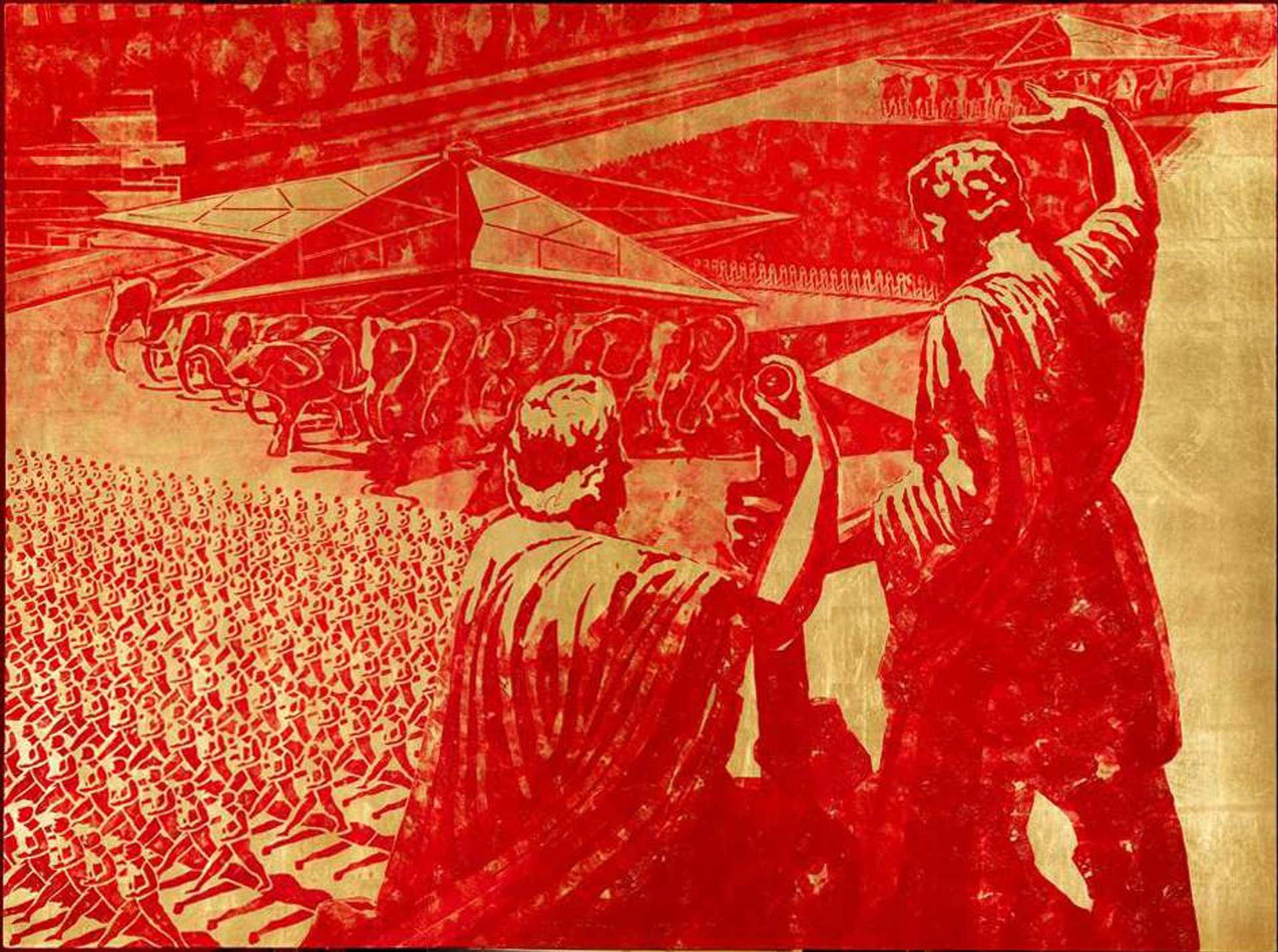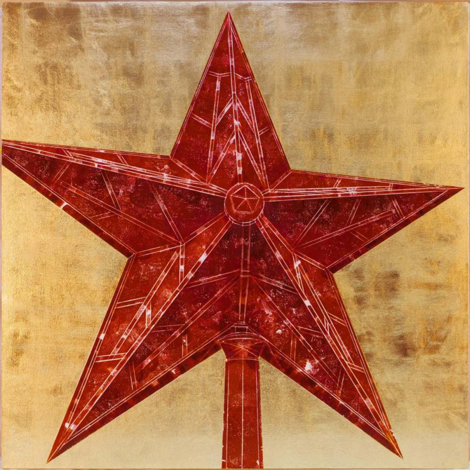 A graduate of the Moscow School of Architecture, Beliayev-Guintovt has created a signature retro-futurist style, based on Moscow’s urban landscape, which merges Soviet and Russian Orthodox imagery. His trademark painting of a Soviet red star with black shadowing set against an iconographic gold background was given a starting price of €5,000 at Moscow’s Vladey auction house in 2021; only works by Ilya and Emilia Kabakov and Oleg Kulik were offered at higher prices in the sale. Vladimir Ovcharenko, the owner of Vladey, says the auction house will not support Beliayev-Guintovt any longer.