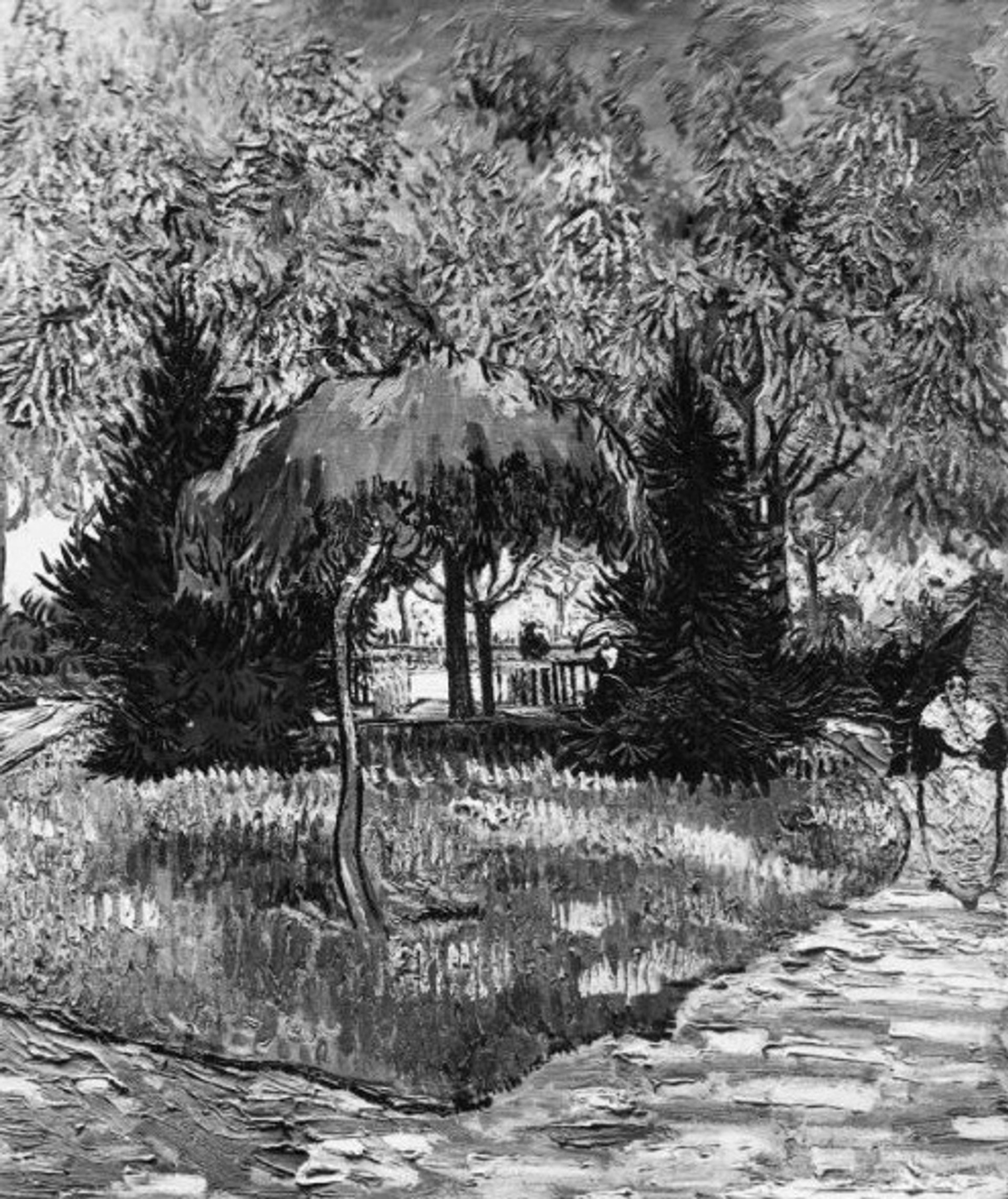 Path in the Public Garden (September 1888) depicts the small public park that lay just outside Van Gogh’s home, the Yellow House. A woman wearing the traditional costume of Arles strolls along the right-hand path, beneath a clump of trees.