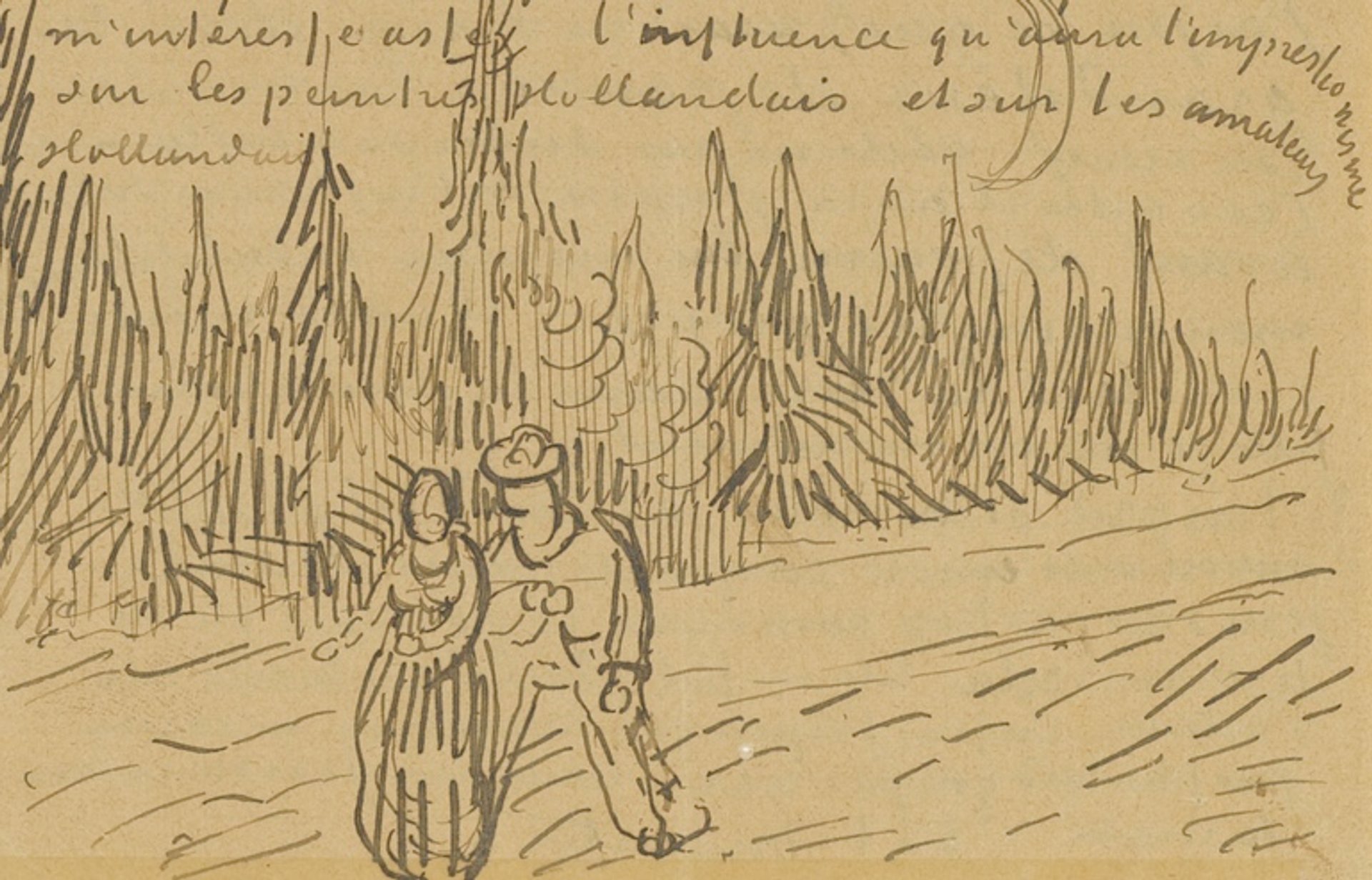 Vincent’s sketch of The Lovers in his letter to Theo, 21 October 1888 Credit: Van Gogh Museum, Amsterdam (Vincent van Gogh Foundation)