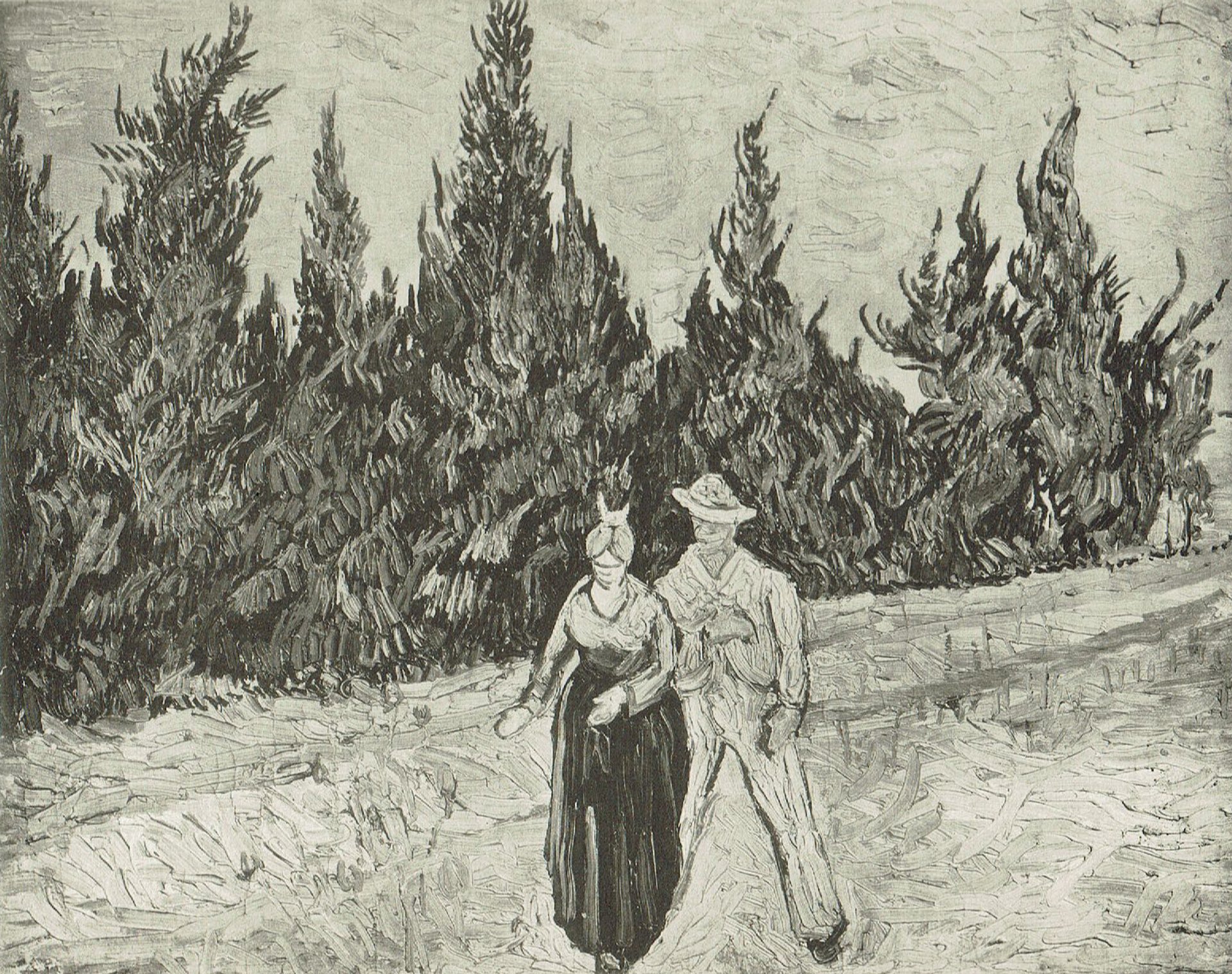 Vincent made a small sketch of the painting in a letter to his brother, along with a short description: “A row of green cypresses against a pink sky with a pale lemon crescent moon. Foreground a piece of waste land, and some sand and a few thistles. Two lovers, the man pale blue with a yellow hat, the woman has a pink bodice and a black skirt.” A number of other Van Gogh paintings include a pair of lovers in a sylvan setting—completed at a time when he was searching for companionship.