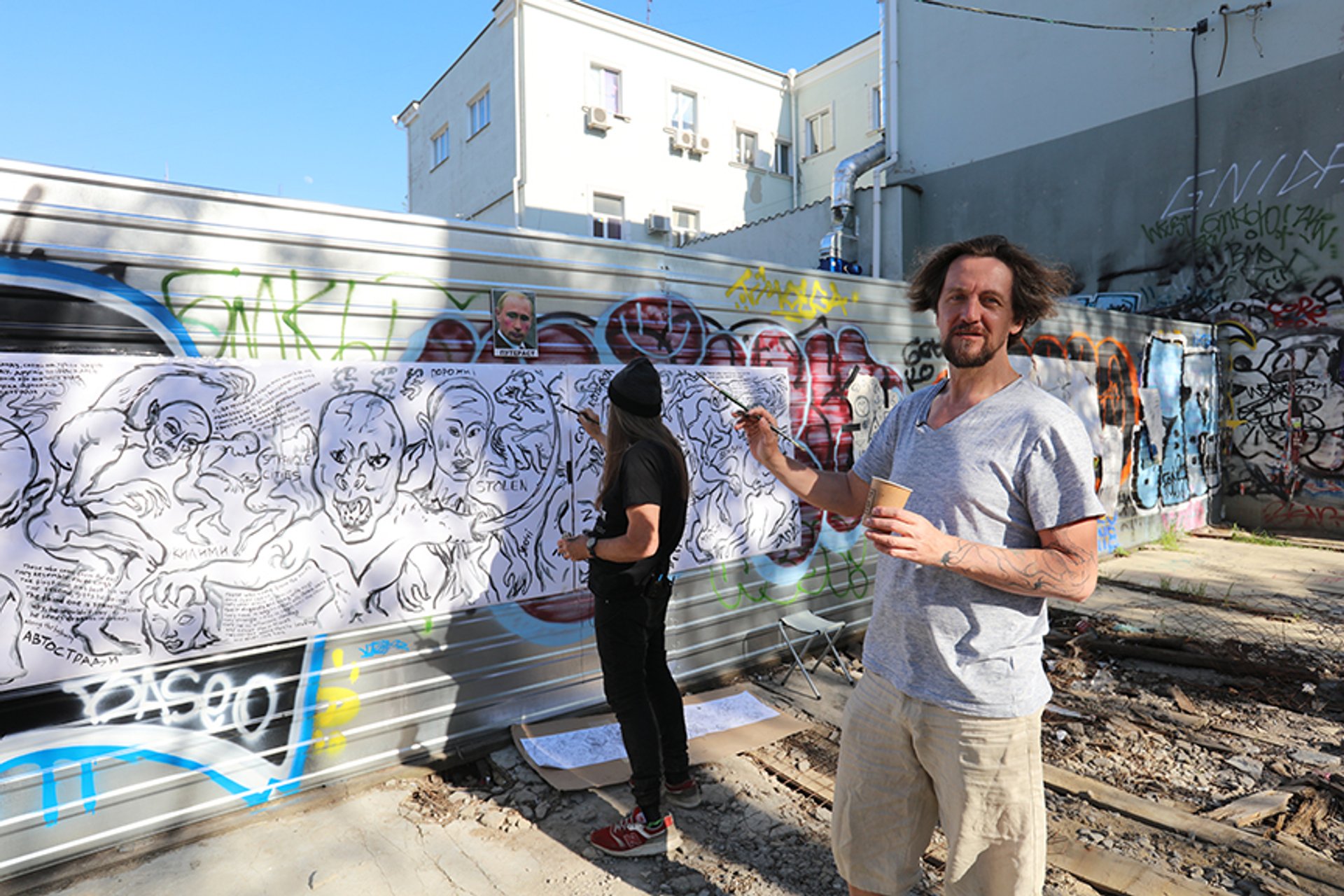 Viktor Solodchuk, Odessan poet, in front of his mural collaboration with George Gittoes. Photo: Hellen Rose