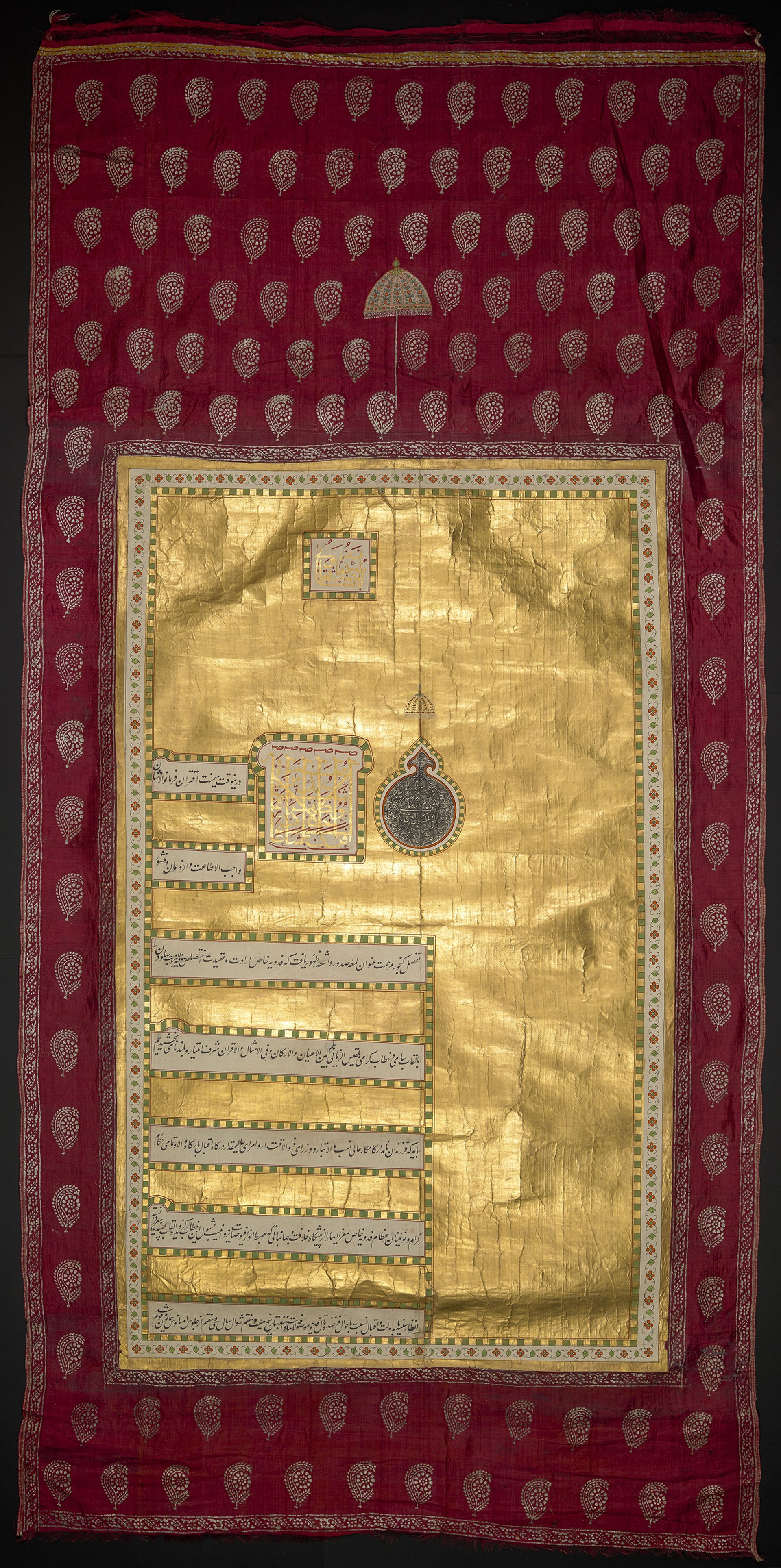 Decree issued by Mughal Emperor Shah ‘Alam II, on red silk brocade with gold calligraphy. India, (1789). Courtesy of The British Library Board