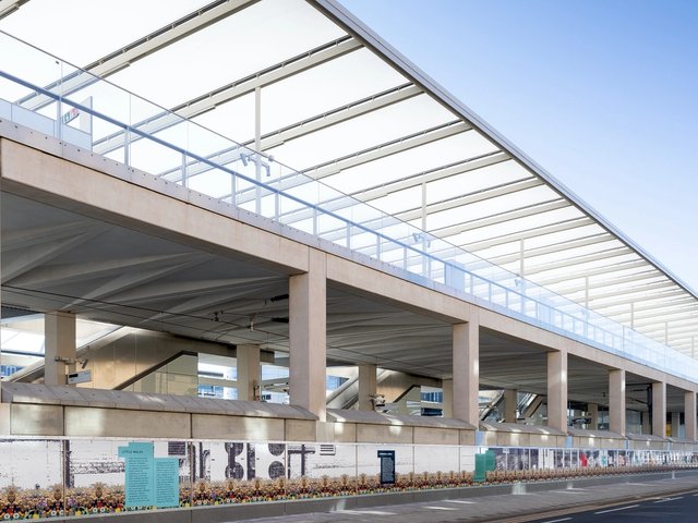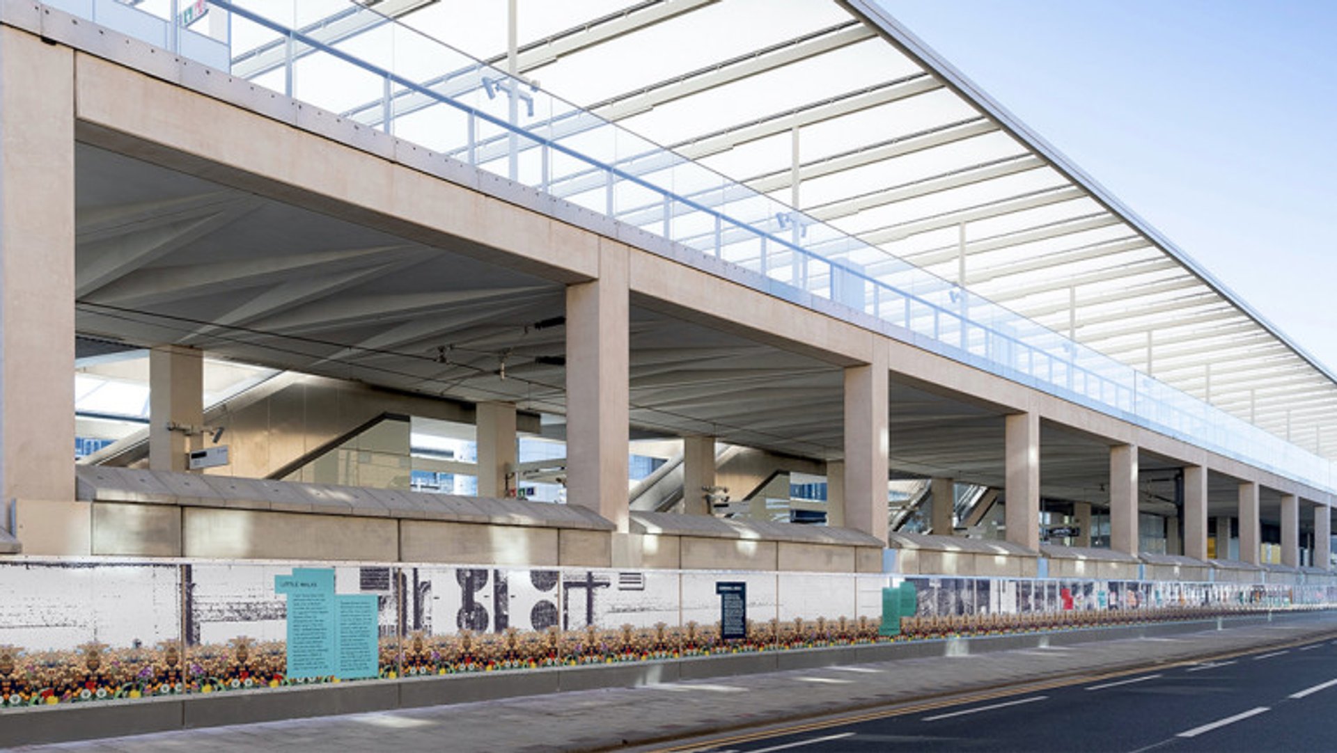 Spectre by Simon Periton is embedded into the exterior glazing of the Elizabeth line station at the eastern ticket hall in Farringdon Station. Courtesy of Crossrail