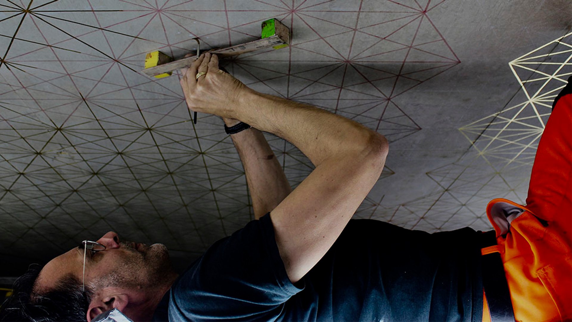 Installing Richard Wright's intricate, geometric gold-leaf pattern onto Tottenham Court Road station. Courtesy of Crossrail