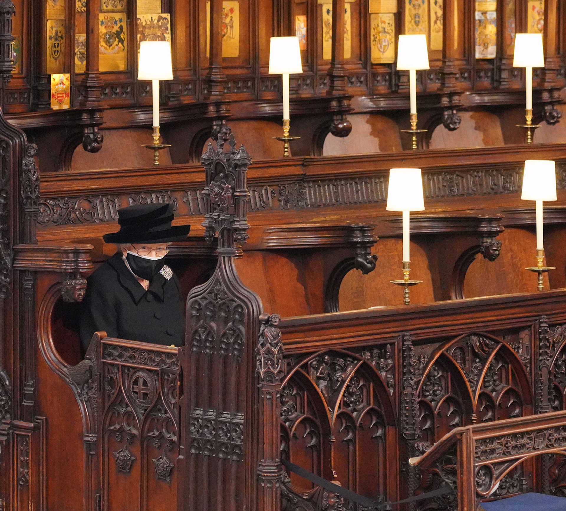The Queen at the funeral of her husband, Prince Philip, Duke of Edinburgh, in St George's Chapel, Windsor Castle, 17 April 2021. Because of Covid-19 pandemic restrictions, the Queen sat alone and in a congregation of just 30 family members Jonathan Brady—WPA Pool/2021 Getty Images
