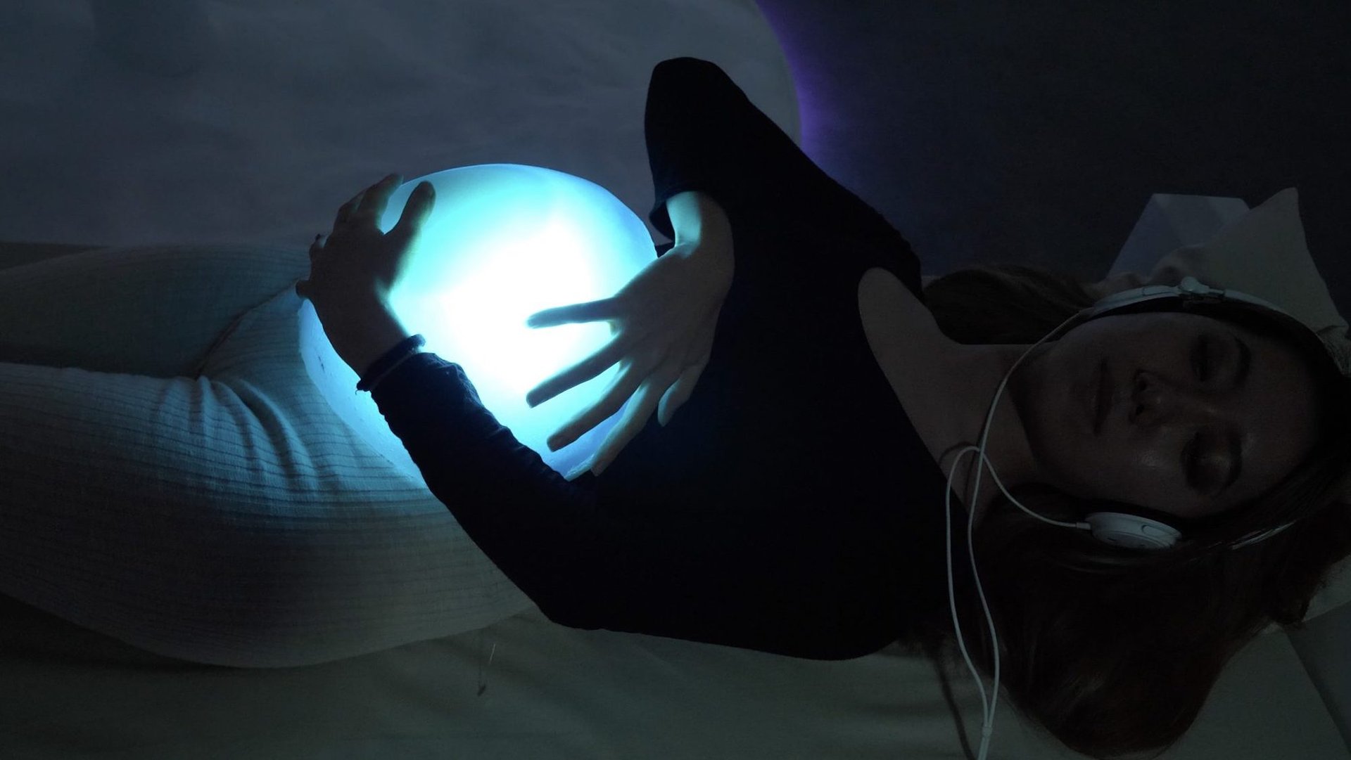 Keiken, Bet(a) Bodies, 2021–2022, wearable haptic womb, digital audio, 9 minutes 12 seconds, sound, silicone, LED light, minicomputer, haptics, amp. Part of Keiken, PLAYER OF COSMIC ༄ؘ ° REALMS, 2022, gamified installation, infinite duration, color, sound, dimensions variable. Courtesy of the artists.