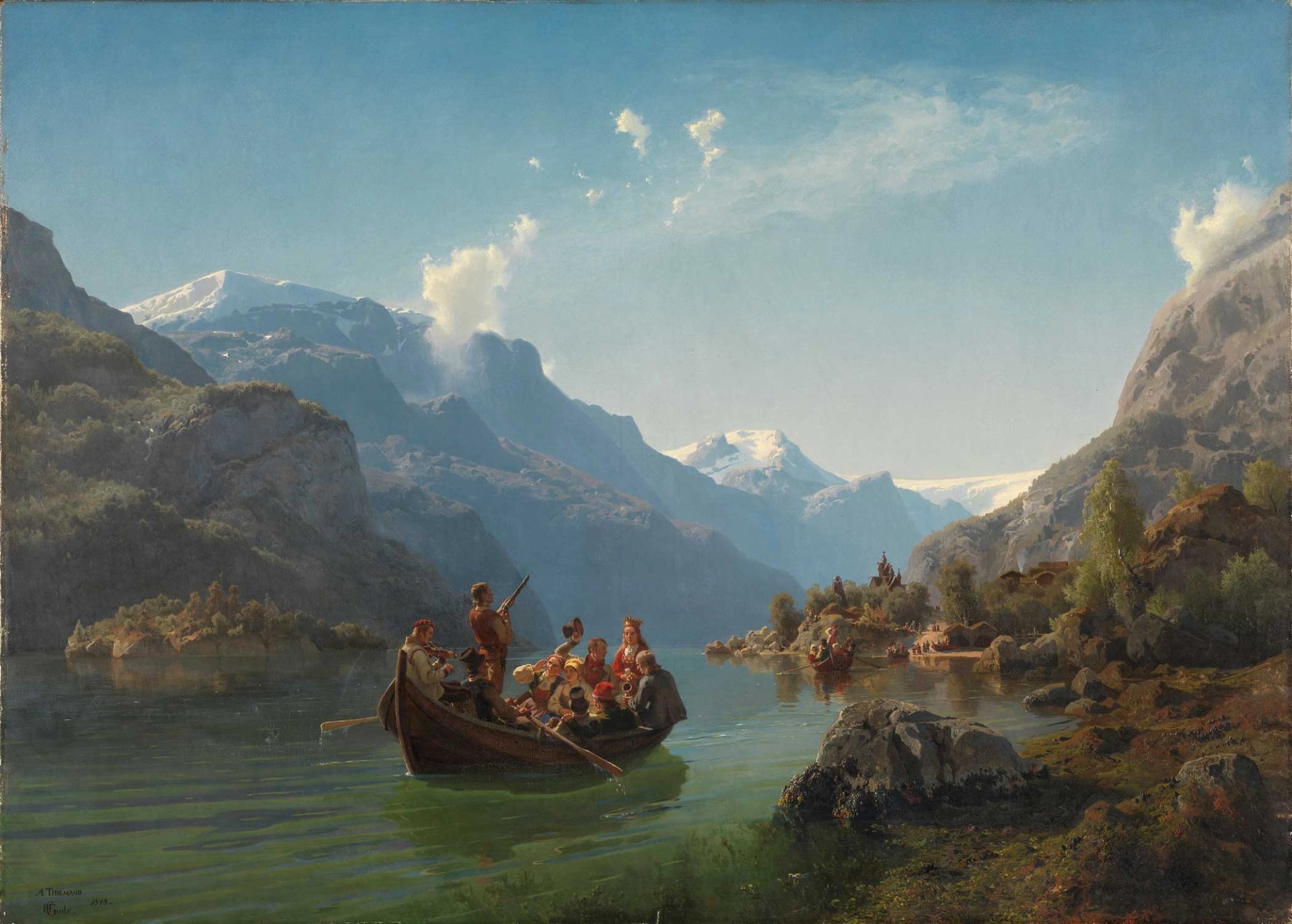 Hans Gude and Adolph Tidemand’s Bridal Procession on the Hardanger Fjord (1848), one of the works that toured Norway after the National Gallery closed in 2019