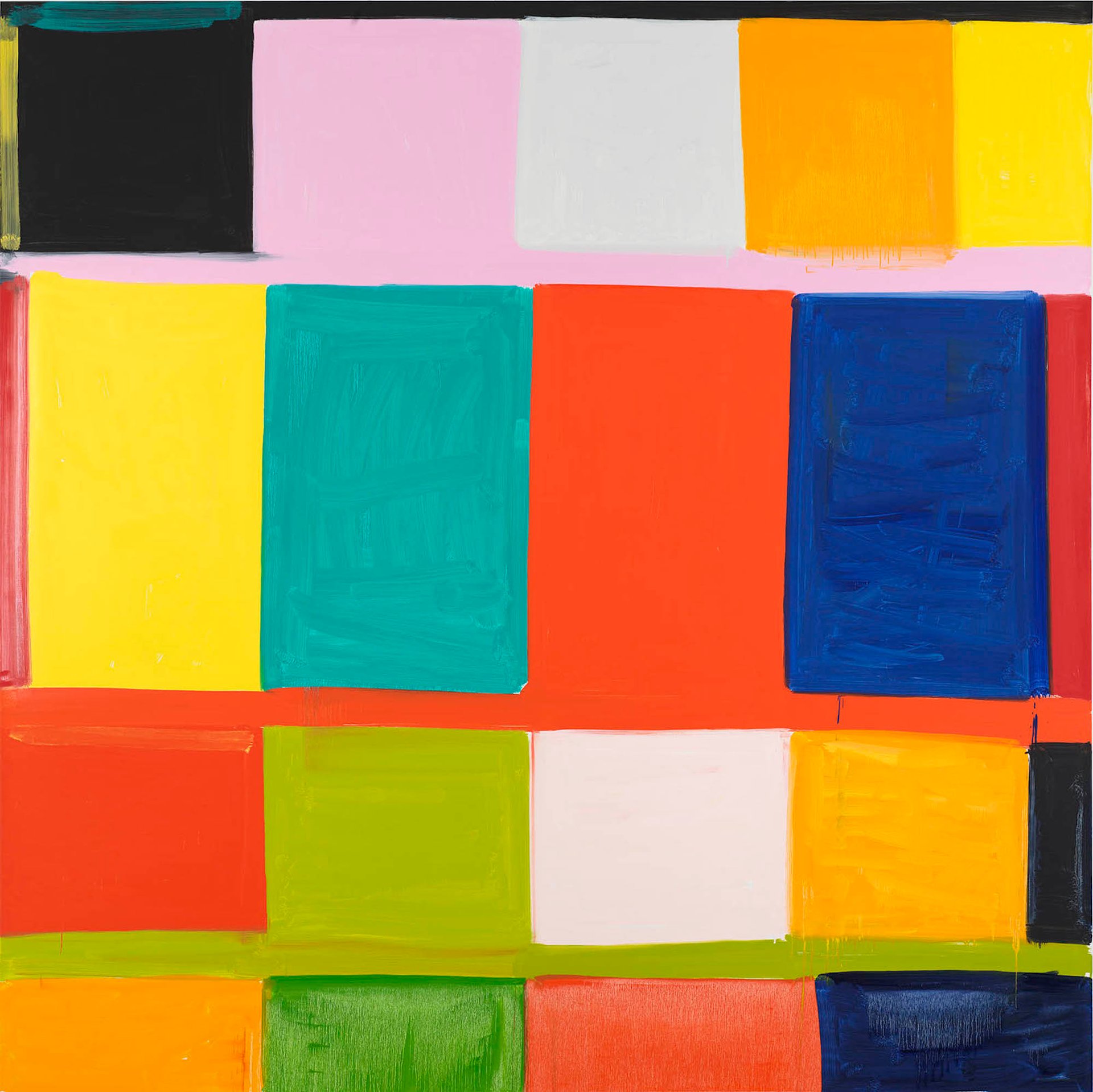 Whitney’s process of improvising within certain self-imposed constraints echoes the conventions of experimental jazz, which he typically listens to while painting. “Nothing’s straight. Nothing’s regular. Everything’s a little crooked,” he says of his preferred studio music, although the description could be applied to his loosely delineated grids of colourful oil paints. “I think that’s really what comes out of the music. It comes out of the beat, it comes out of how people walk, the way people wear their hat, just a little off. I think about all of those kinds of things and want them in the painting.”