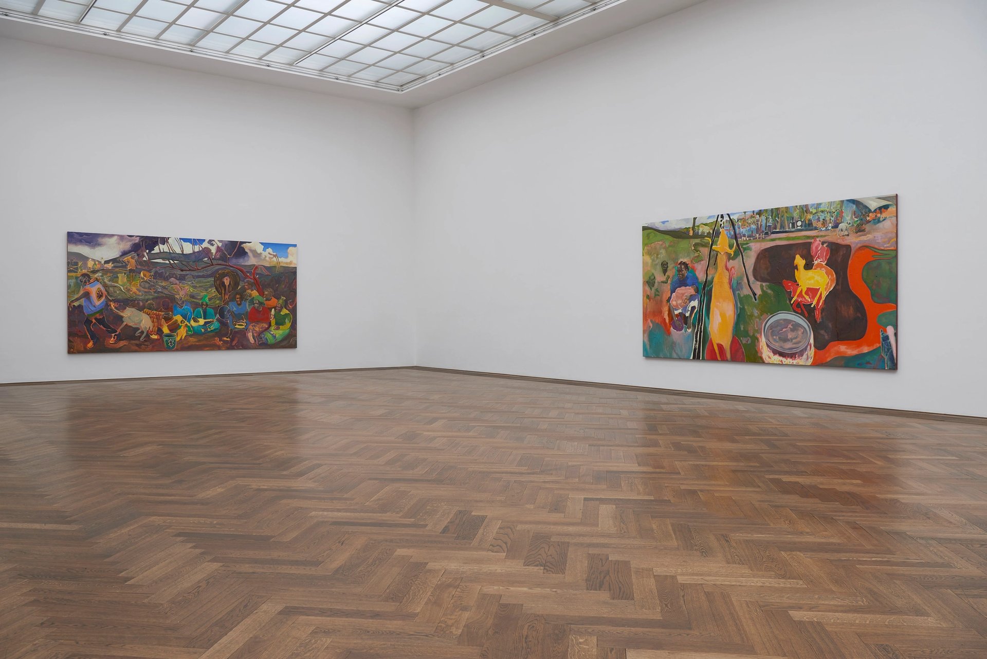 Installation view of Michael Armitage's show You, Who Are Still Alive at Kunsthalle Basel. Dandora (Xala, Musicians) (2022, left) and Amongst the Living (2022, right) Photo: Philipp Hänger / Kunsthalle Basel