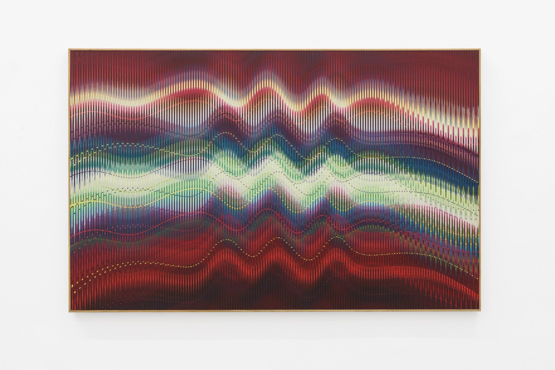 Palatnik’s exploration of the optical effects of movement is also evident in his Progressão (Progression) works, made from a series of undulating rectangular strips of wood that were sometimes painted or left raw to expose the natural luster of the materials, often jacaranda trunks or rosewood. The compositions resemble magnetic fields that compellingly appear to follow but also amplify the longitudinal arrangement of the wood grain, conveying a both naturalistic and otherwordly frequency. Palatnik also created glass compositions in a similar vein.