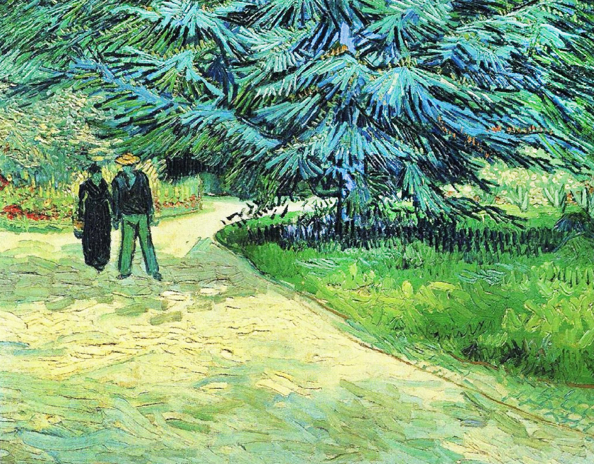 And why do lovers feature in Van Gogh’s paintings? We can only speculate, but he may well have been searching for female companionship, and have felt pangs of envy when he saw strolling couples in Arles. Couples therefore appear as idealised figures in some of his landscapes.