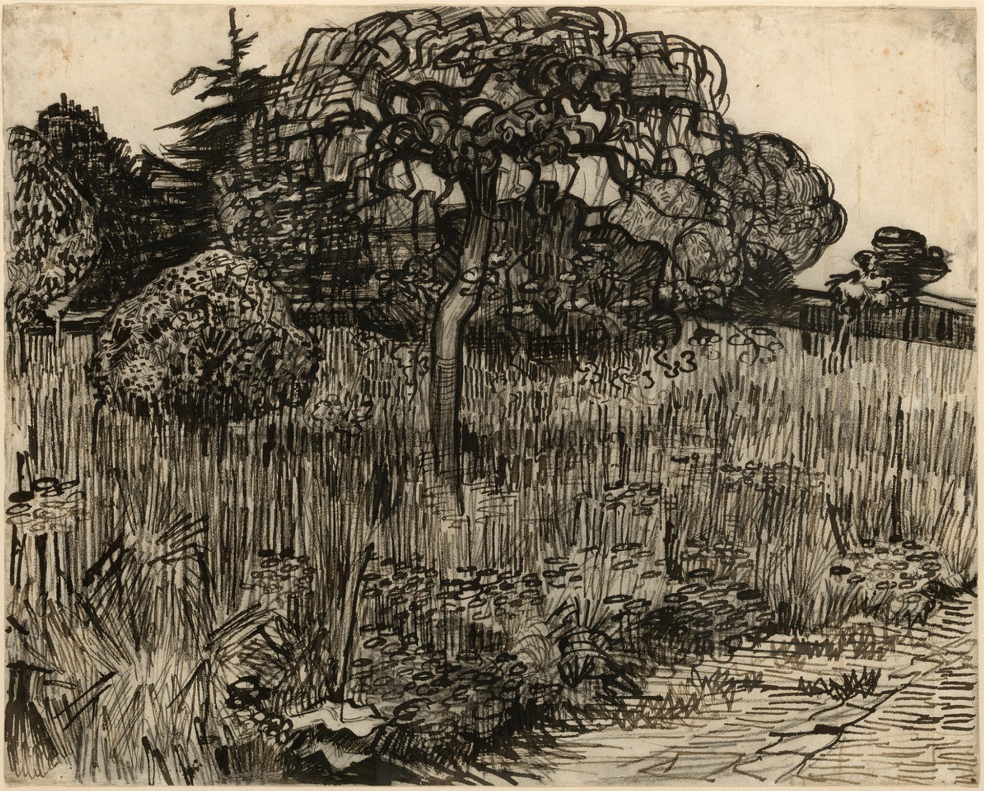 Weeping Tree (May 1889) has never been exhibited in the UK. Drawn with a reed pen, the scene gives the impression of a country park—not a busy urban area. This time the landscape is devoid of human figures. Although depicting a willow, it is significant that Vincent calls it “the weeping tree”, perhaps indicative of his state of mind as he was about to enter the asylum.
