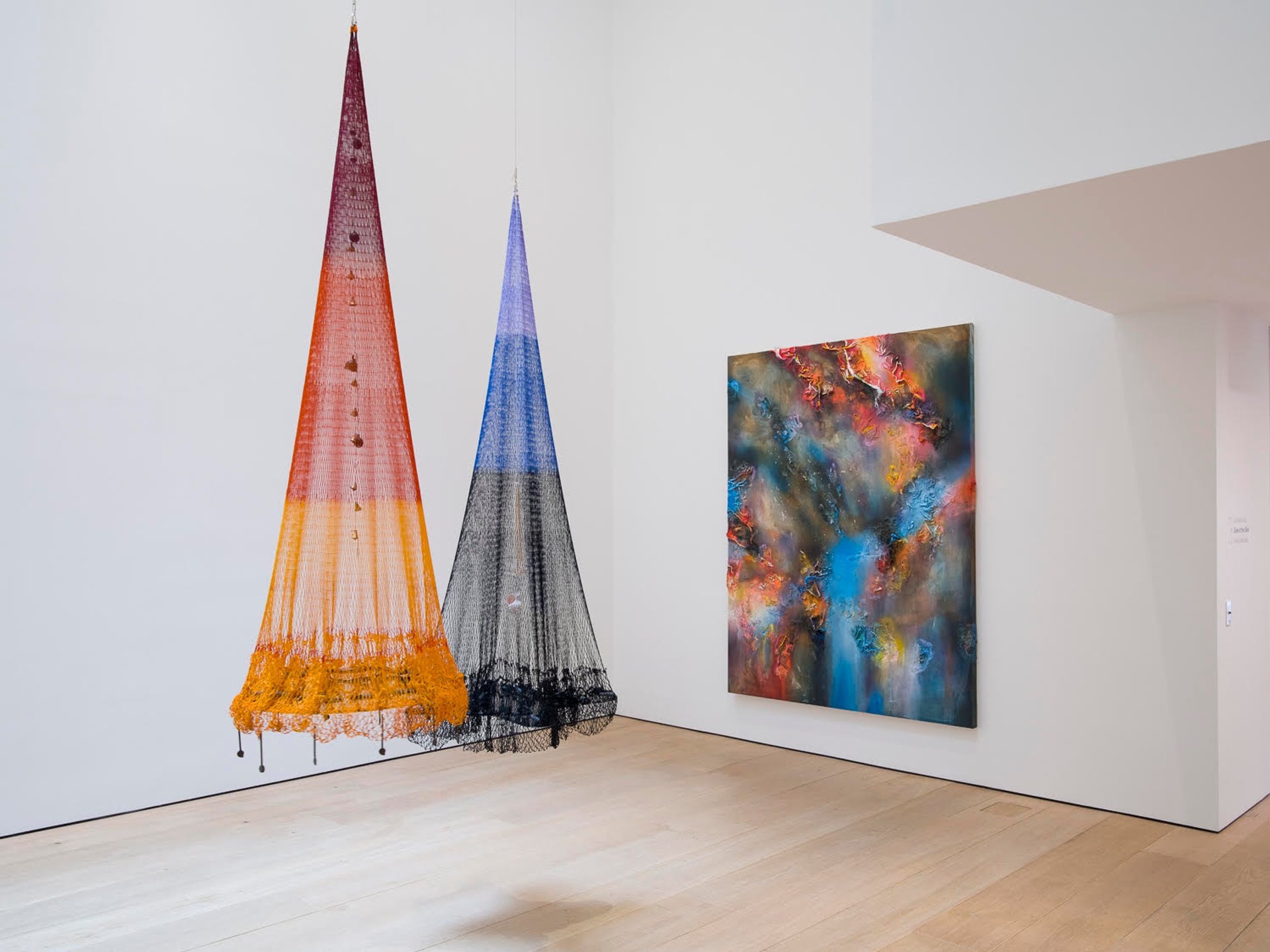 Another artist-organised grouping is the multimedia artist Teresita Fernández’s show Eyes of the Skin at her representative gallery, Lehmann Maupin. Similar to the emphasis on tactility and the material’s emotional alchemy in the Brooklyn-based artist’s’s absorbing paintings, the nine featured artists unite in their commitment to a sensory multitude. The Oklahoma-based artist Francheska Alcántara’s wall-mounted sculpture Tiger Jaw IV (2022) has a chunky wooden base covered with Hispano cuaba soap, acrylic and resin; Carolina Caycedo’s mixed-media installation Nuestro Tiempo (2018) includes a fishing net washed in a bold fuchsia hue, as well as metal chain, palm mat, wool charm, a tambourine and flowers—carrying ceremonial and introspective cues in the artist’s monumental rendition.