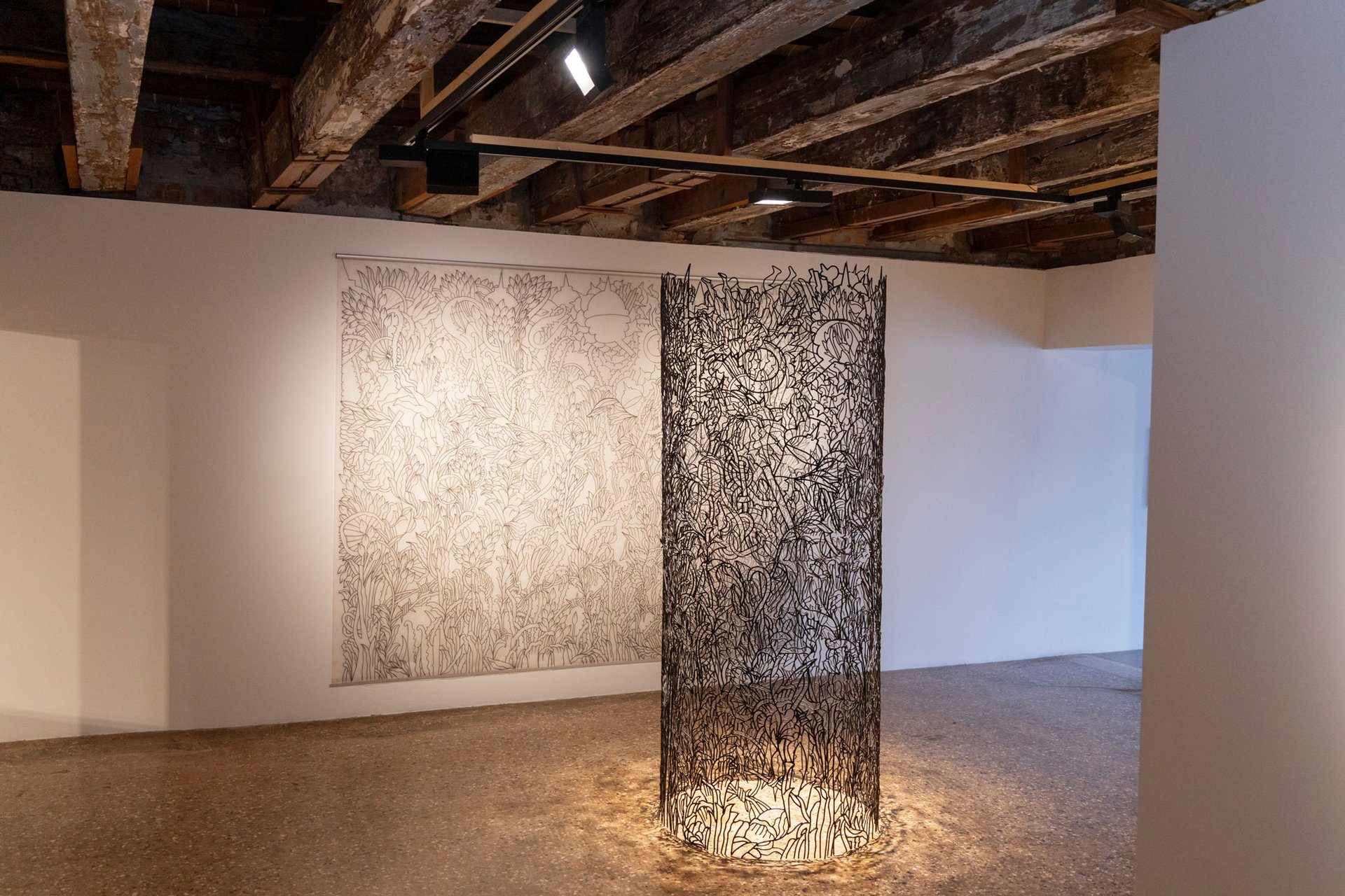 At Frieze (12-16 October), the gallery will present Covert Drawings, a series of ink on paper works created alongside the artist’s welded metal installation titled Covert, which is on show at the European Cultural Centre in Venice for the duration of this year’s Biennale (until 27 November). Thenuwara created the 2m-tall sculpture by making line drawings, combining motifs such as lotus leaves and guns, that were then welded onto a hollow drum. “The work stands as a monolith representation of his explorations of Sri Lankan politics since 1997,” according to a gallery statement.