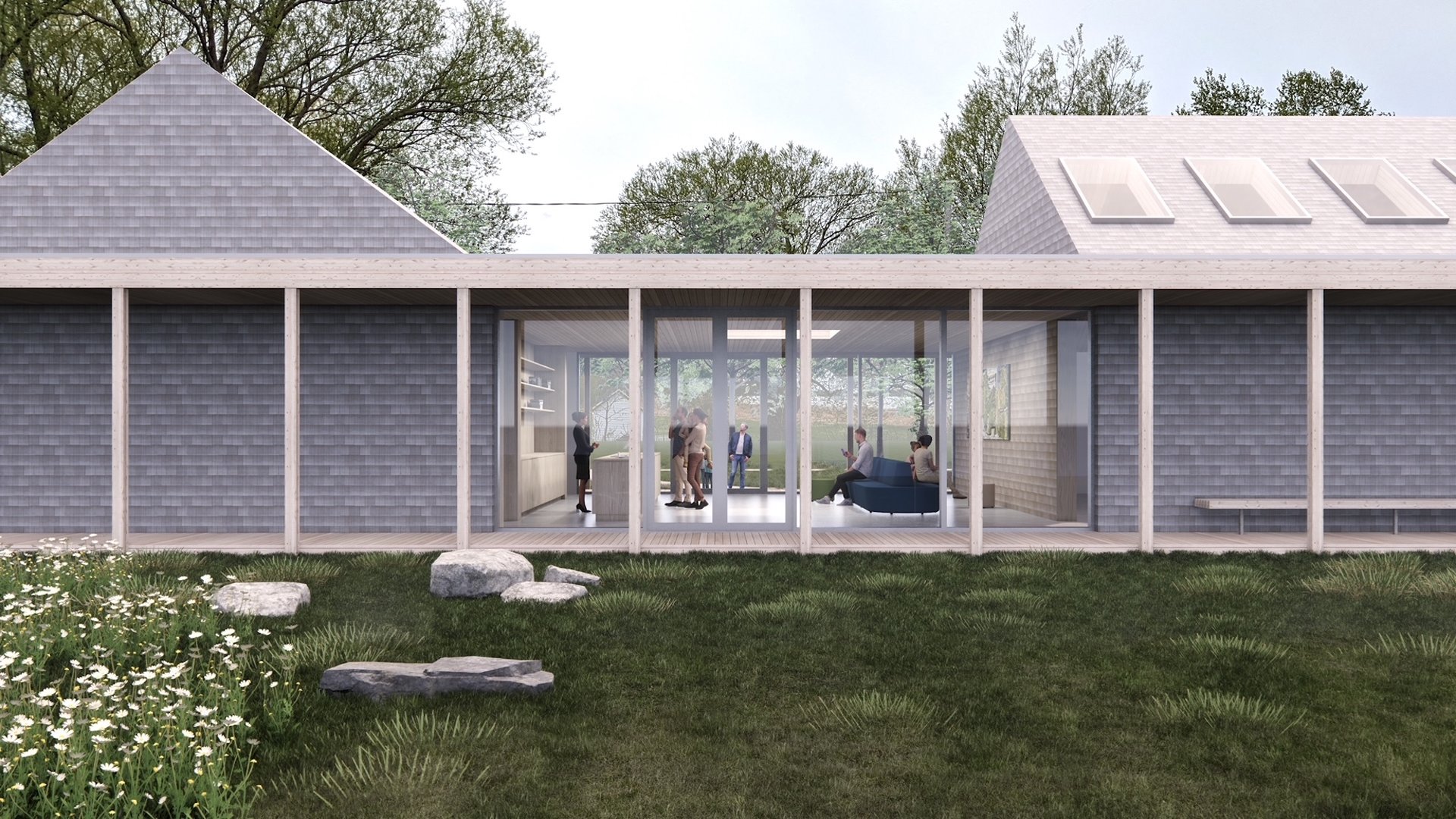 Plans for the museum, designed by the architecture firm Atelier Pierre Thibault, call for two wood-shingled structures—one modelled on Riopelle’s house on Île-aux-Oies, the other on his studio in the Laurentian mountains—with a glass-walled vestibule connecting them and a covered veranda with benches running around the entire exterior of the building.